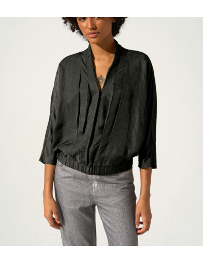 • Caractéristiques clés : Blouse oversize avec encolure type polo fendue et fermée par un bouton en nacre naturelle. Petites fronces sur l'encolure au milieu du dos, épaules et poignets en plissé cristal réalisé dans notre atelier d'Ambérieu en Bugey. Satin fluide et plombant, il reflète la lumière et sublime les couleurs.