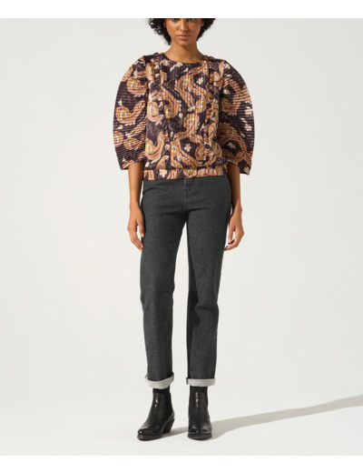 • Caractéristiques clés : Blouse à l'encolure ronde et aux manches courtes plissées avec volume manches ballons. Incrustations de bandes verticales et bas élastiqué donnant à la blouse un côté sport chic, blousant, mais pas serré. Satin de polyester plissé en bouillonné. Matière fluide et douce, aspect satiné, agrémentée de notre imprimé Maison élaboré par notre Bureau de style. Plissé savoir-faire effectué dans notre atelier à Ambérieu en Bugey.