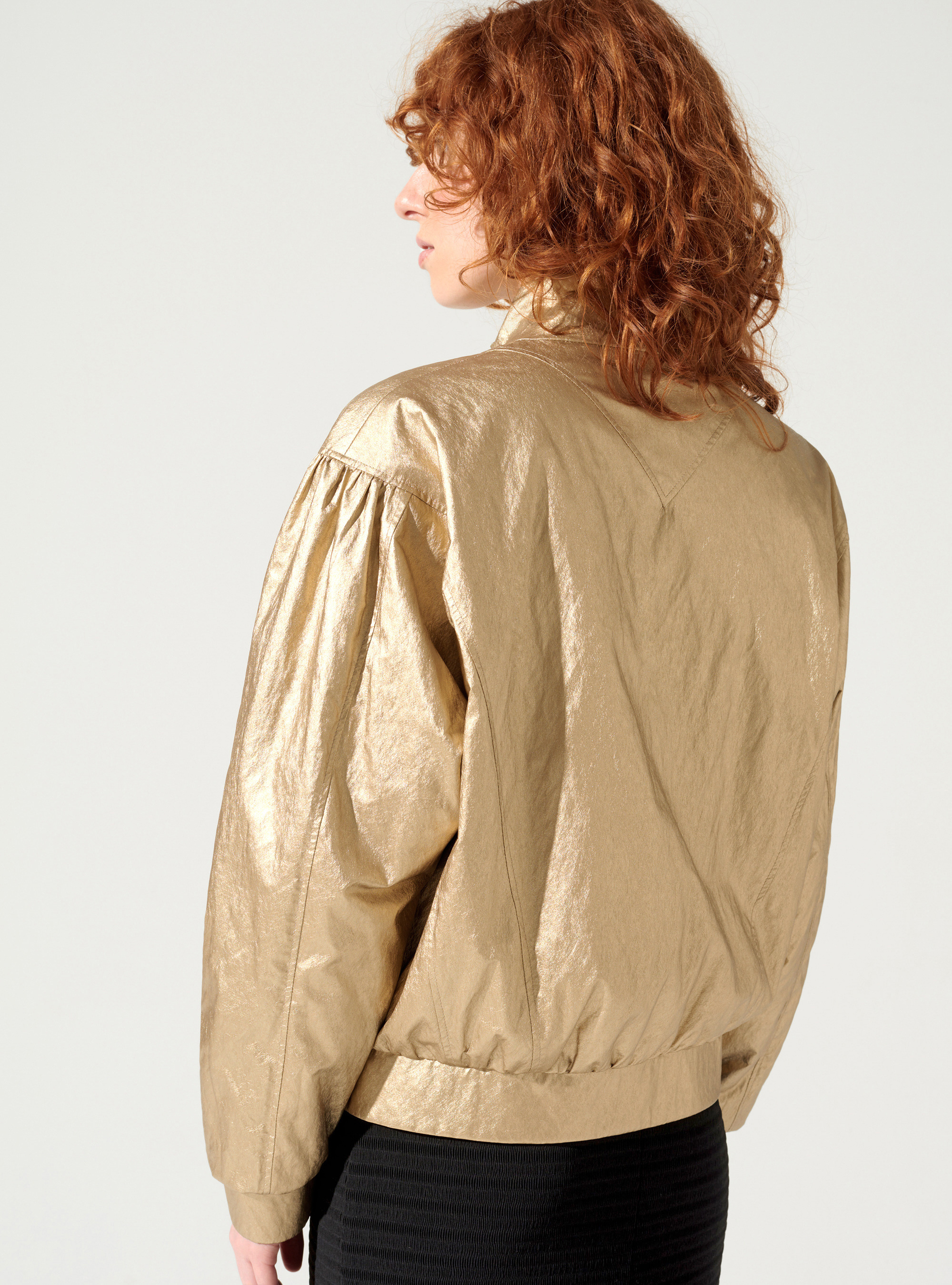 • Caractéristiques clés : Blouson à manches longues et bouffantes façon chauve-souris, froncées aux épaules et avec poignets resserrés dans le bas. Une pièce unique au volume volontairement exagéré aux épaules et appuyé sur les hanches pour une silhouette 70's renforcé par son tissu technique enduit d'un film doré or pâle et son aspect légèrement froissé. Doublé avec notre imprimé de la saison et une fine ouate pour lui donner un coté plus gonflant et doux.