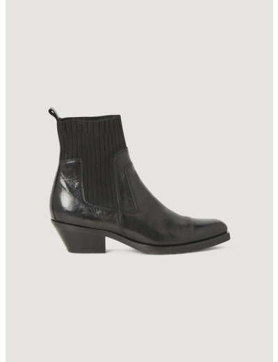 • Caractéristiques clés : Boots à la forme pointue style santiag, faciles à enfiler grâce à l'élastique "chaussette" sur les côtés et en haut de tige. Semelle en cuir avec large trépointe tout le tour et talon bottier d'une hauteur de 4,5 cm.