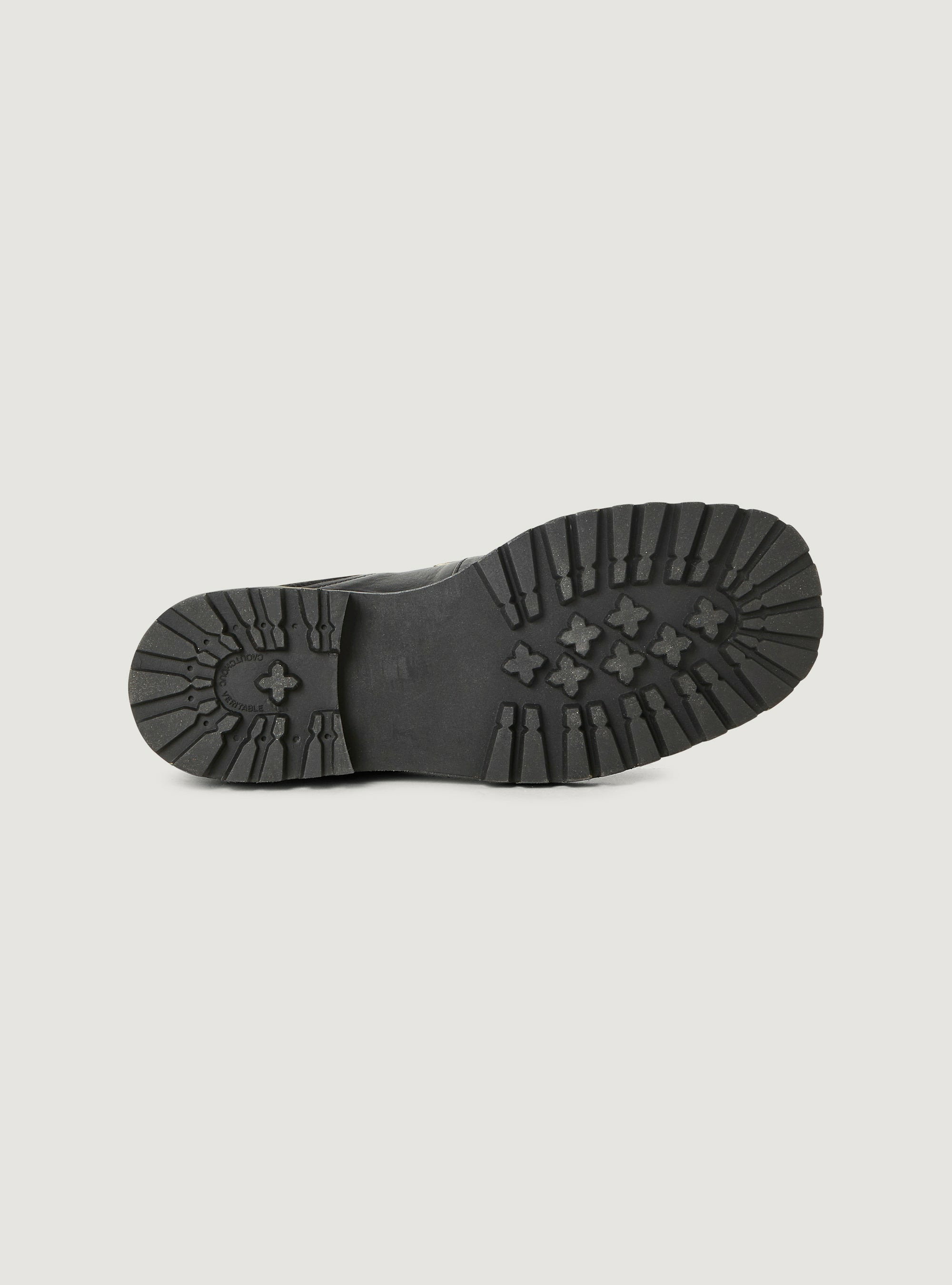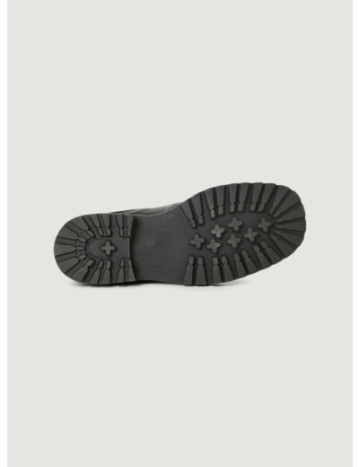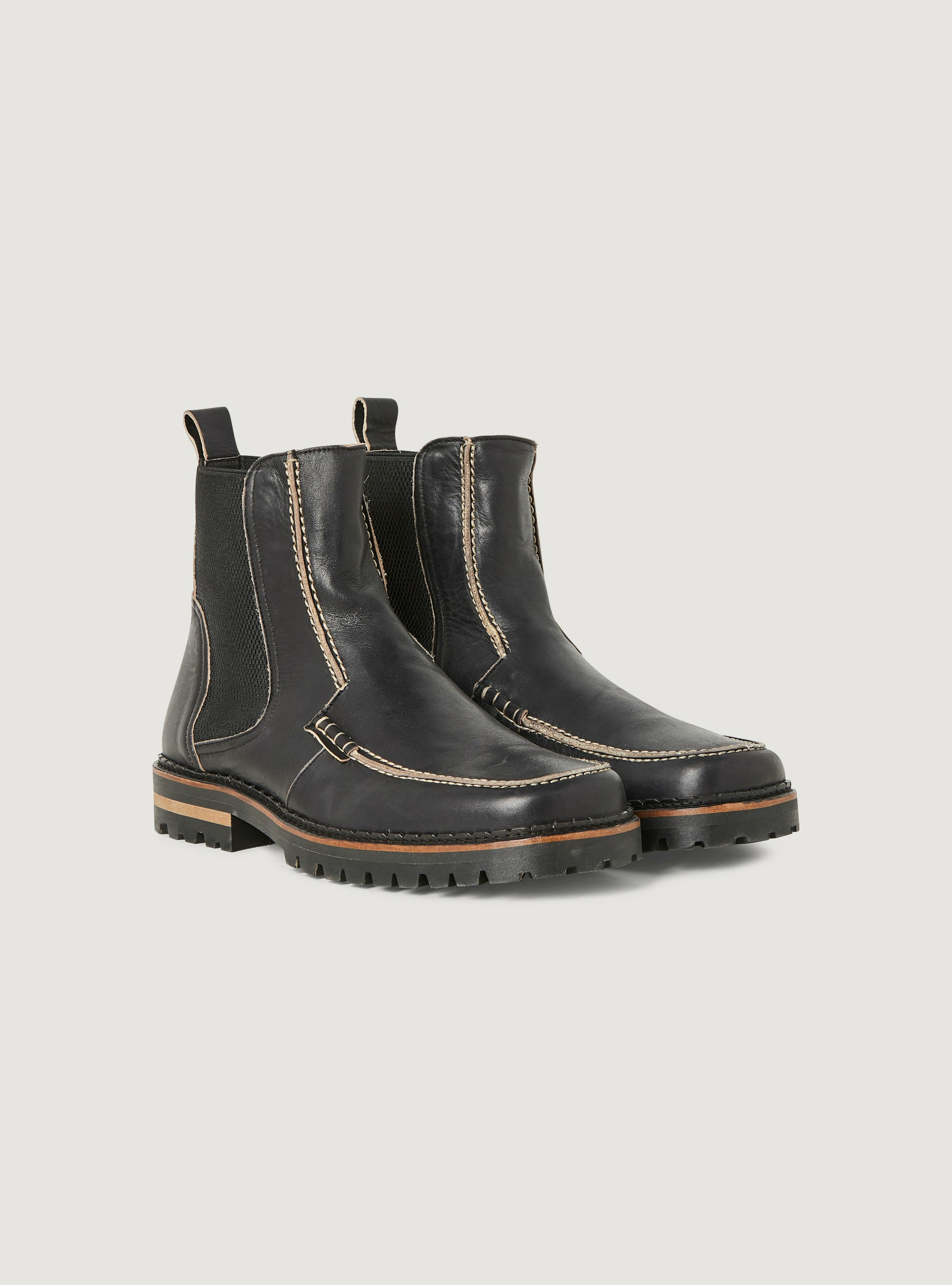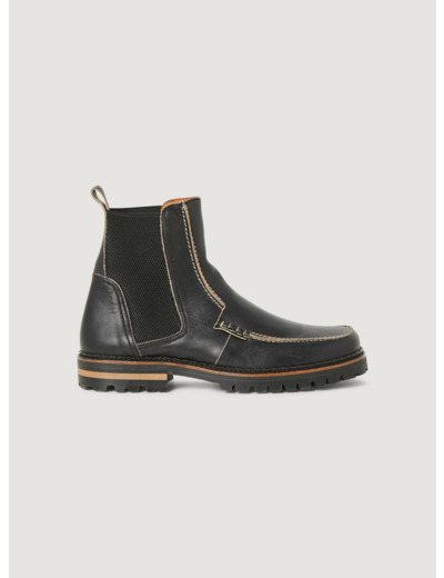 • Caractéristiques clés : Bottines en cuir lisse noir avec tranches naturelles contrastées, piquage sellier également contrasté et plateau en cuir bord franc. Son élastique sur les côtés permet un enfilage pratique. Semelle en caoutchouc bicolore crantée avec trépointe tout le tour. Talon de 3 cm pour une cambrure de 1 cm.