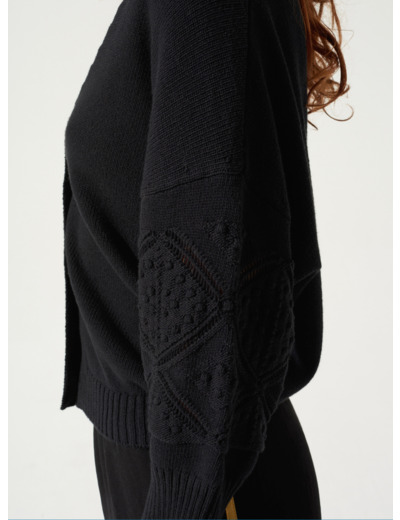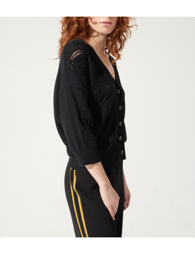 • Caractéristiques clés : Cardigan à manches 3/4 et à l'encolure en V plongeant. Vous aimerez le détail des points de crochet sur les manches ainsi que sur la partie droite du cardigan, faisant d'un basique une pièce unique.