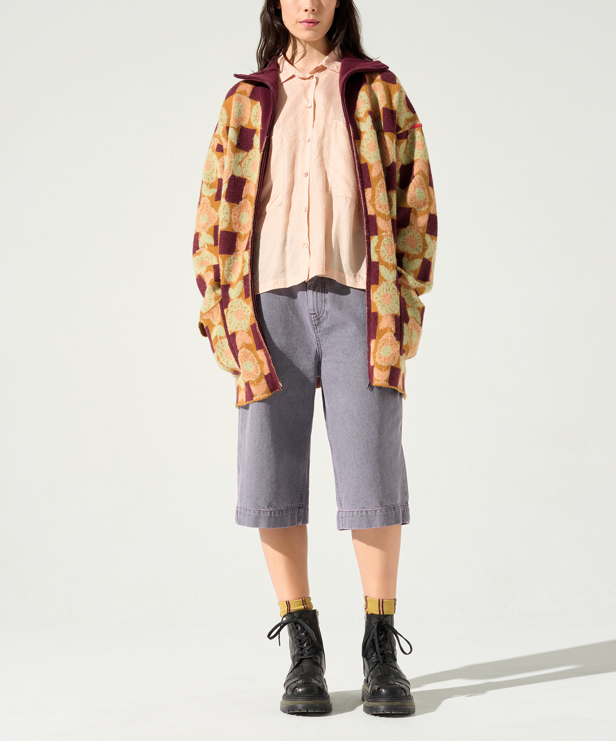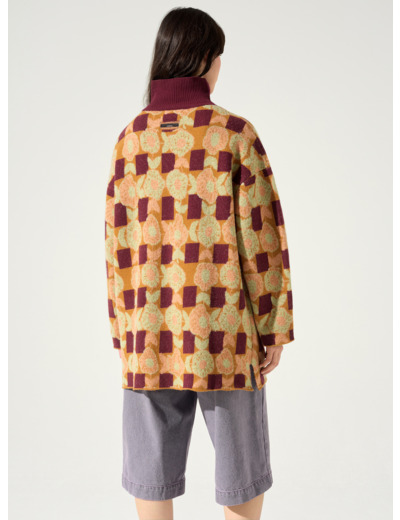 • Caractéristiques clés : Manteau zippé avec col montant camionneur en côtes unies. Volume ample renforcé par les larges manches et les grandes poches plaquées sur le devant. Matière chaude à la main compacte, dessin spécial de la Maison en jacquard et détails point main en fil contrasté.