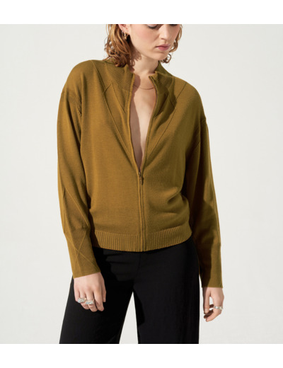 • Caractéristiques clés : Gilet à col montant zippé et resserré au niveau du cou, des grands poignets et du buste avec des bords côtes. Volume légèrement trapèze, emmanchures basses avec manches esprit gigot.