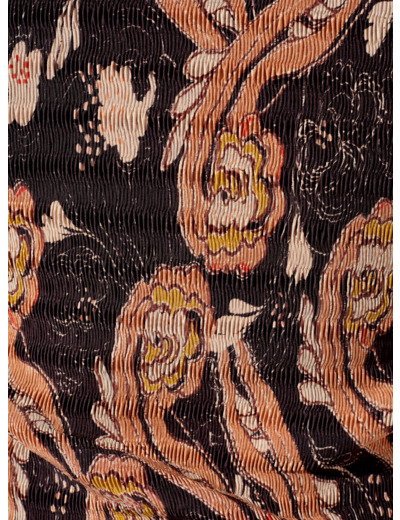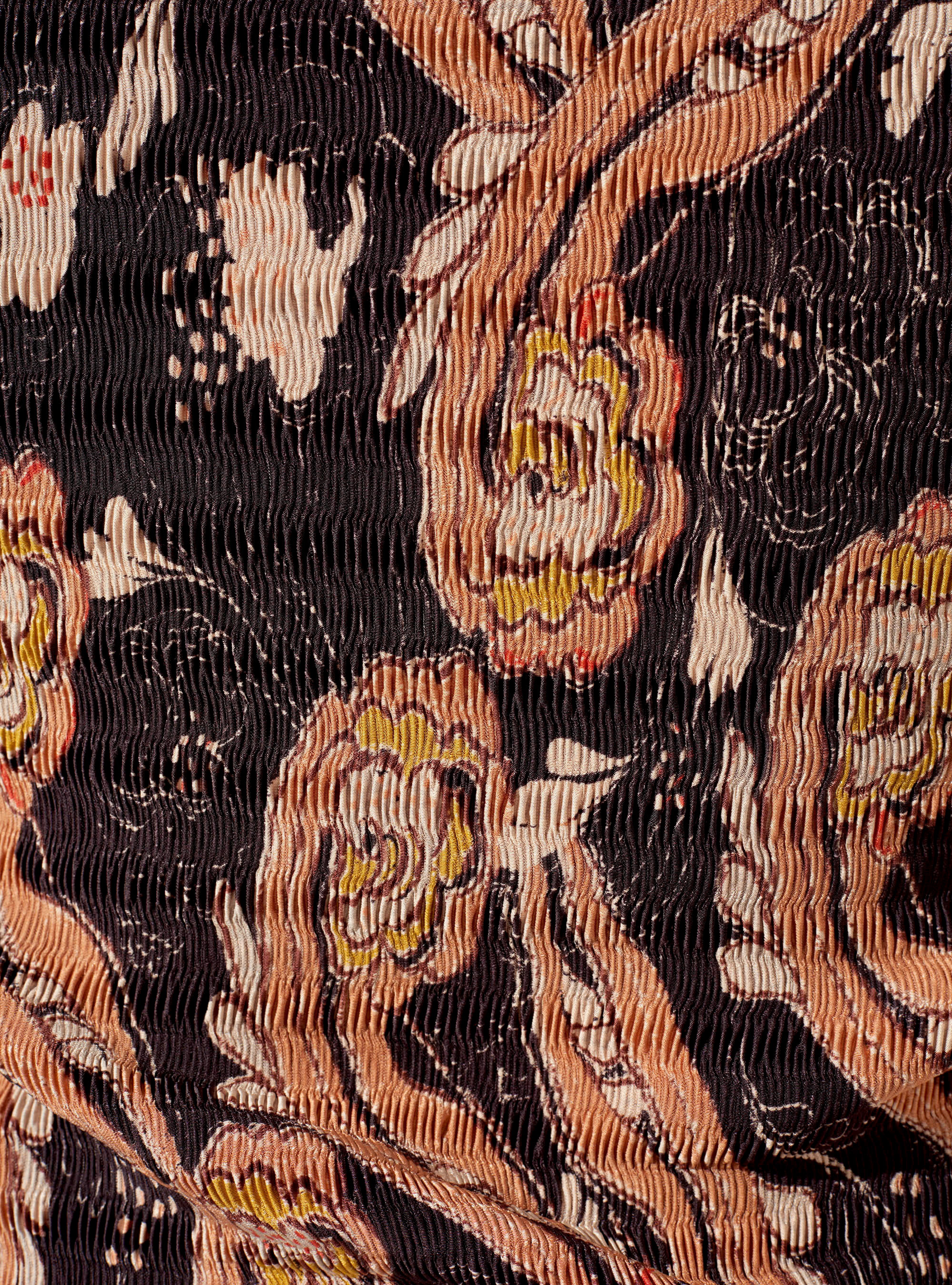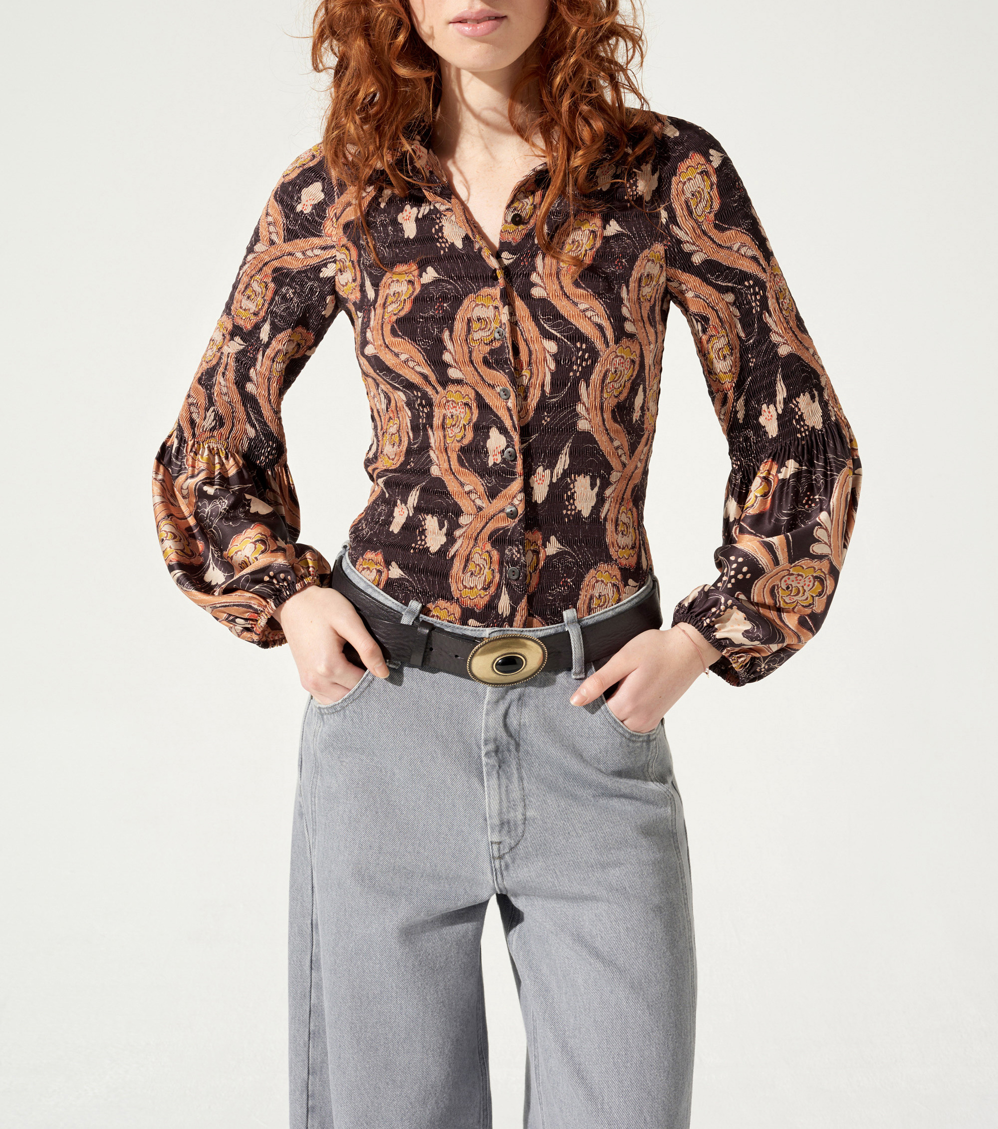 • Caractéristiques clés : Chemise près du corps avec boutonnage en nacre naturelle. Manches longues appuyées aux épaules et bouffantes dans le bas, resserrées aux poignets par un élastique. Satin de polyester plissé en bouillonné. Matière fluide et douce, aspect satiné, agrémentée de notre imprimé Maison élaboré par notre Bureau de style. Plissé savoir-faire effectué dans notre atelier à Ambérieu en Bugey.