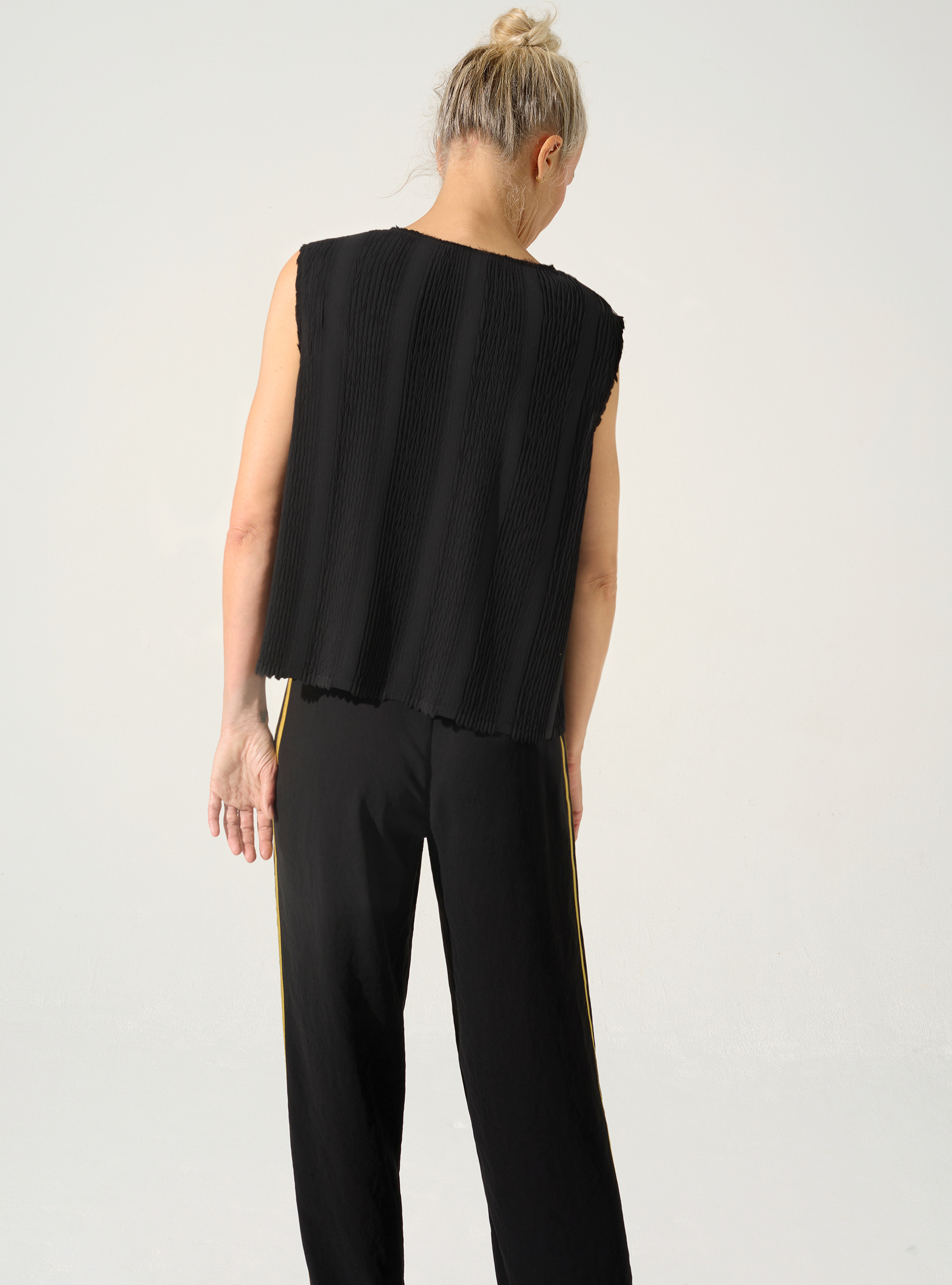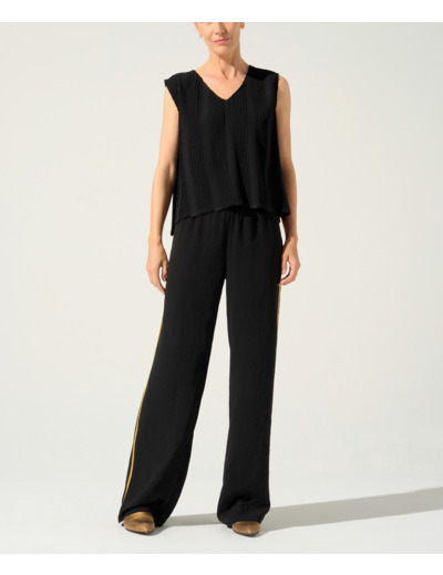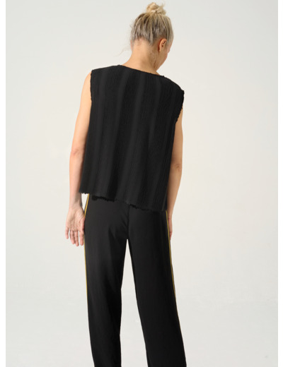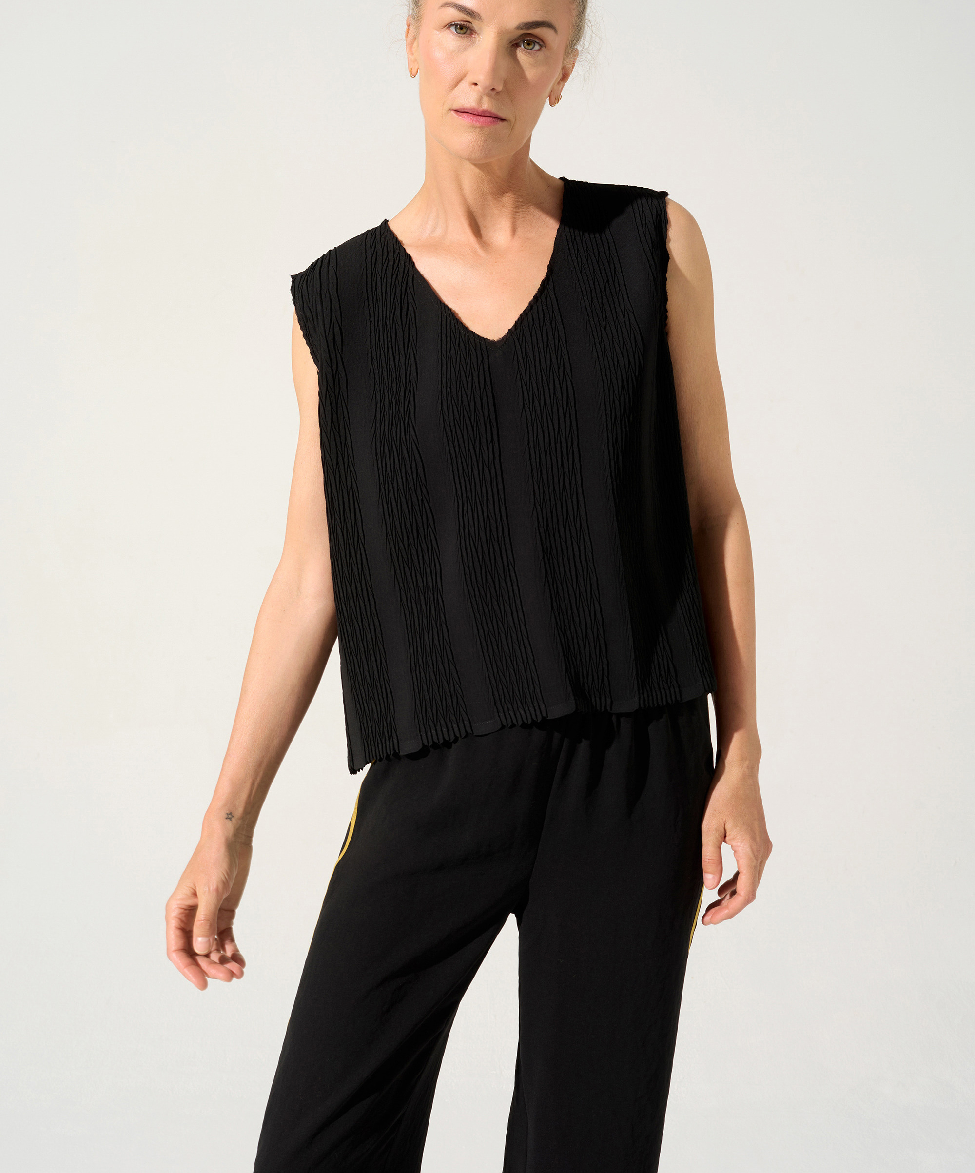 • Caractéristiques clés : Débardeur à larges bretelles. Finitions au niveau de l'encolure en V et des manches en bords nets qui lui donnent un côté rebelle. Crêpe de polyester plombant, matière emblématique de la marque permettant de recevoir nos plissés Maison. Plissé chevrons effectué pièce par pièce dans notre atelier d'Ambérieu en Bugey.