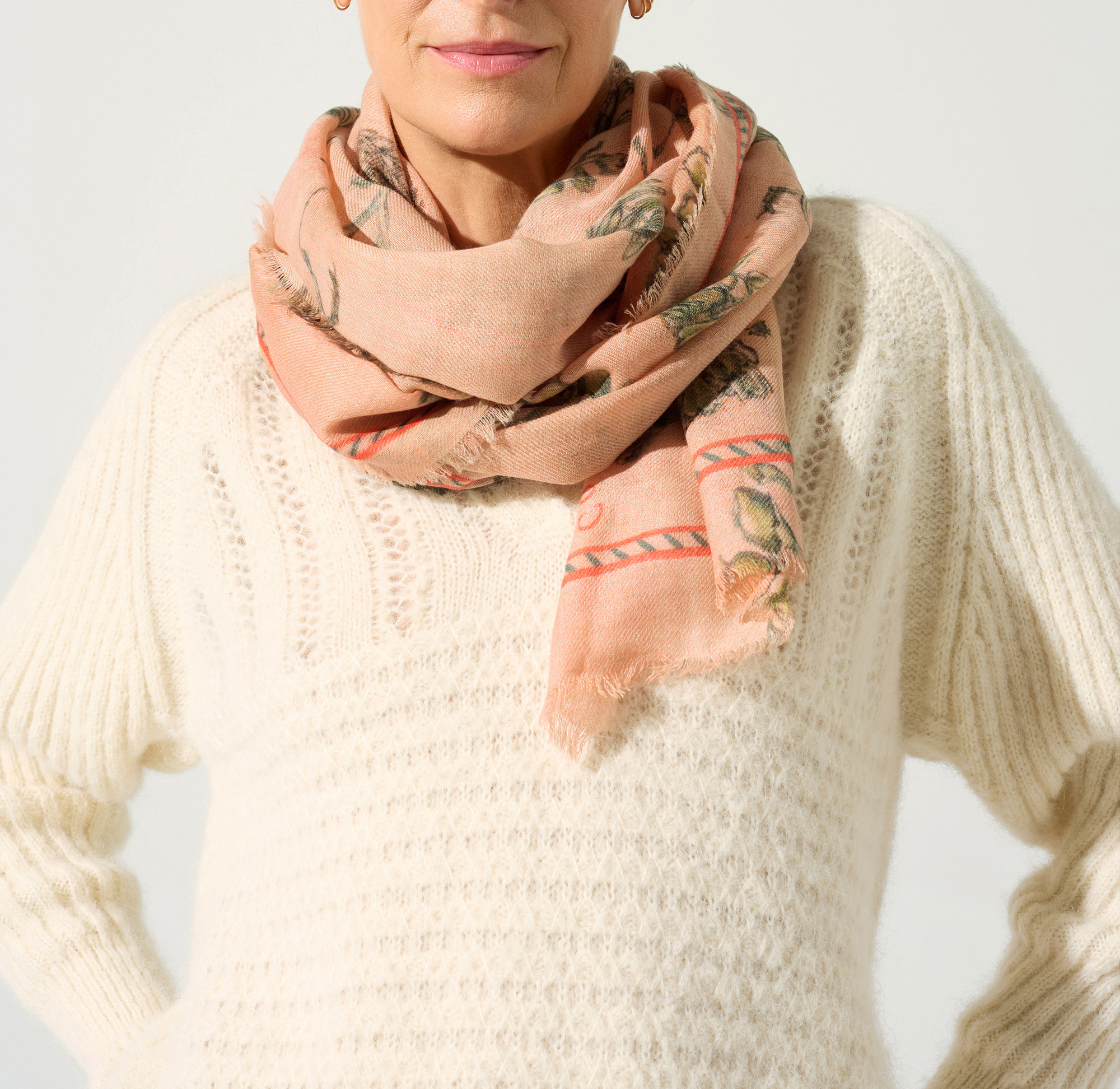 • Caractéristiques clés : Écharpe rectangulaire 60 x 190 cm frangée tout le tour et imprimée avec notre motif végétal "Botaniste".