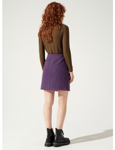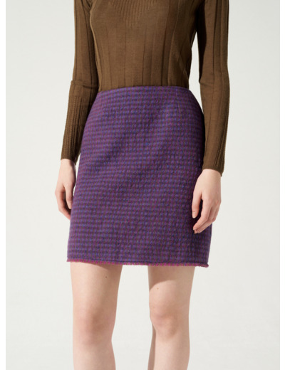 • Caractéristiques clés : Jupe courte frangée dans le bas et entièrement doublée. Sa matière en lainage façonné avec un visuel de petits carreaux lui procure un aspect cloqué irrégulier.