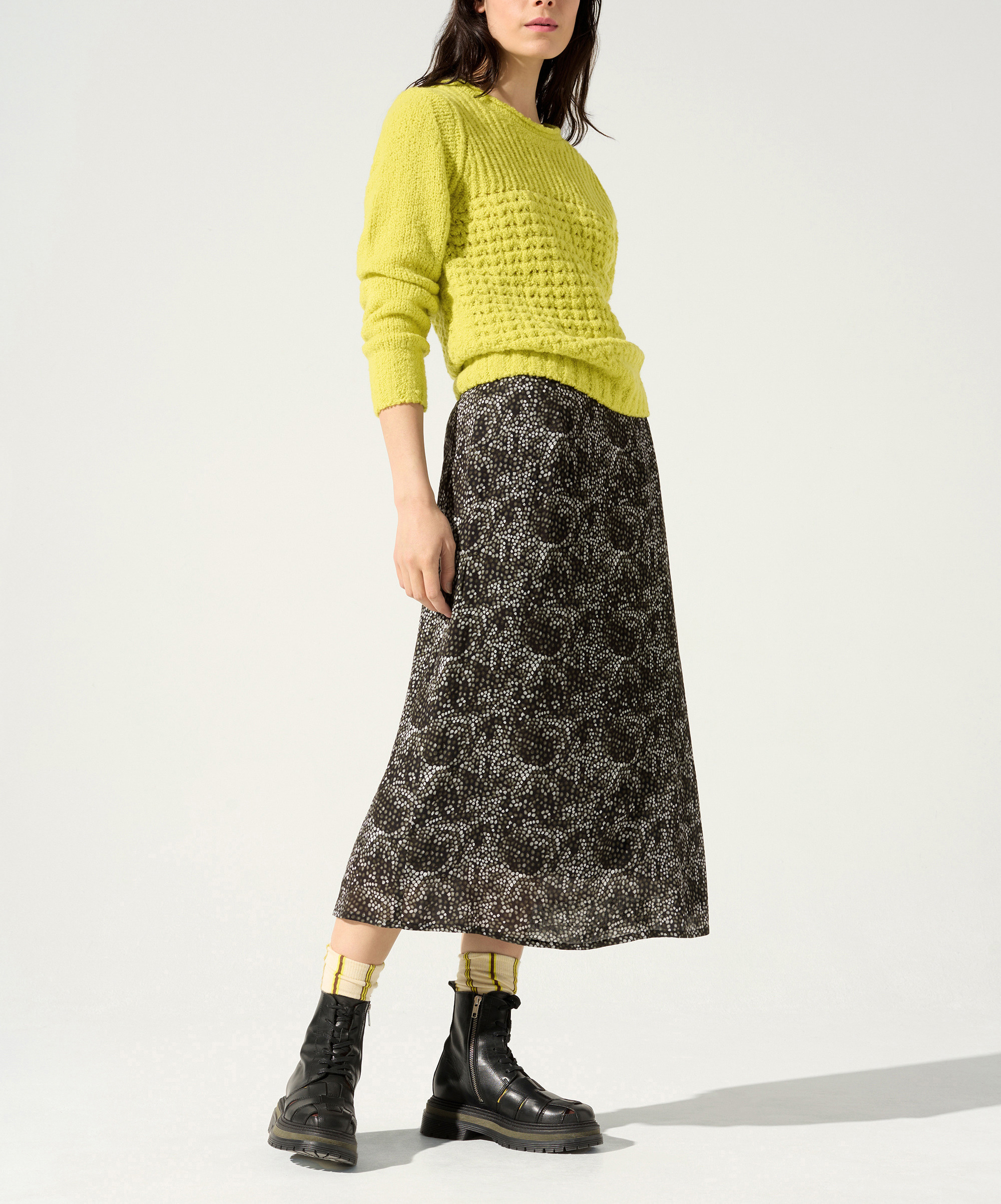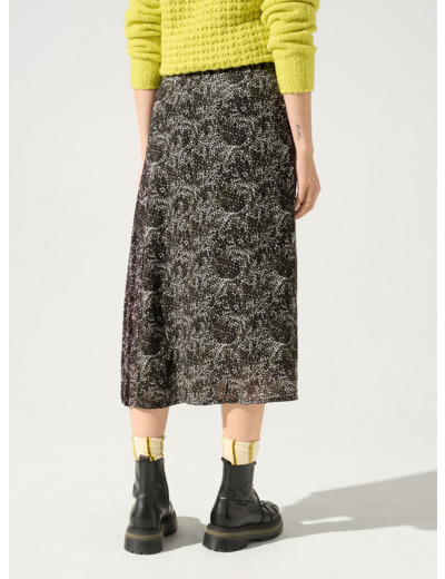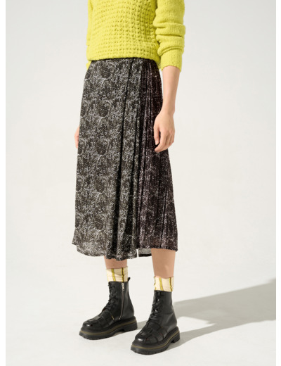 • Caractéristiques clés : Jupe asymétrique légèrement évasée dans le bas, longueur sous genoux. Une pièce originale croisée sur le devant en portefeuille et son pli plat sur un côté. Le zip invisible dans le dos permet un enfilage optimal. Vous aimerez sa doublure et son mix de matières : la partie plissée est en polyester pour ses atouts techniques, réalisée dans notre atelier d'Ambérieu-en-Bugey, l'autre partie est en viscose pour sa fluidité. Imprimé élaboré par notre Bureau de style.