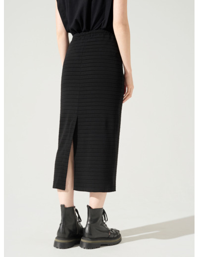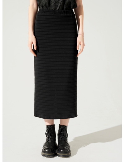 • Caractéristiques clés : Jupe droite en tube longueur mi-mollets. Sa fente ainsi que sa taille élastiquée permet un confort optimal toute la journée. Plissé bouillonné savoir-faire de la maison réalisé dans notre atelier d'Ambérieu en Bugey.