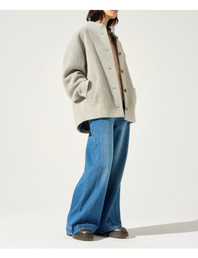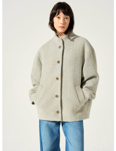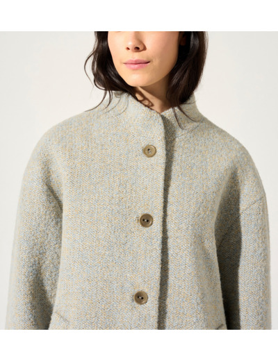 • Caractéristiques clés : Manteau court enveloppant à la forme boule accentuée par le grand pli creux du dos et son col montant. Sa matière lainage mélangée avec aspect bouclette offre la douceur du mélange subtil de coloris pastel. Doublé en coton avec notre imprimé de la saison.