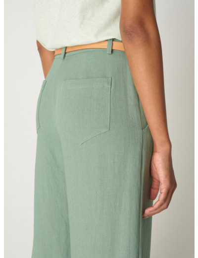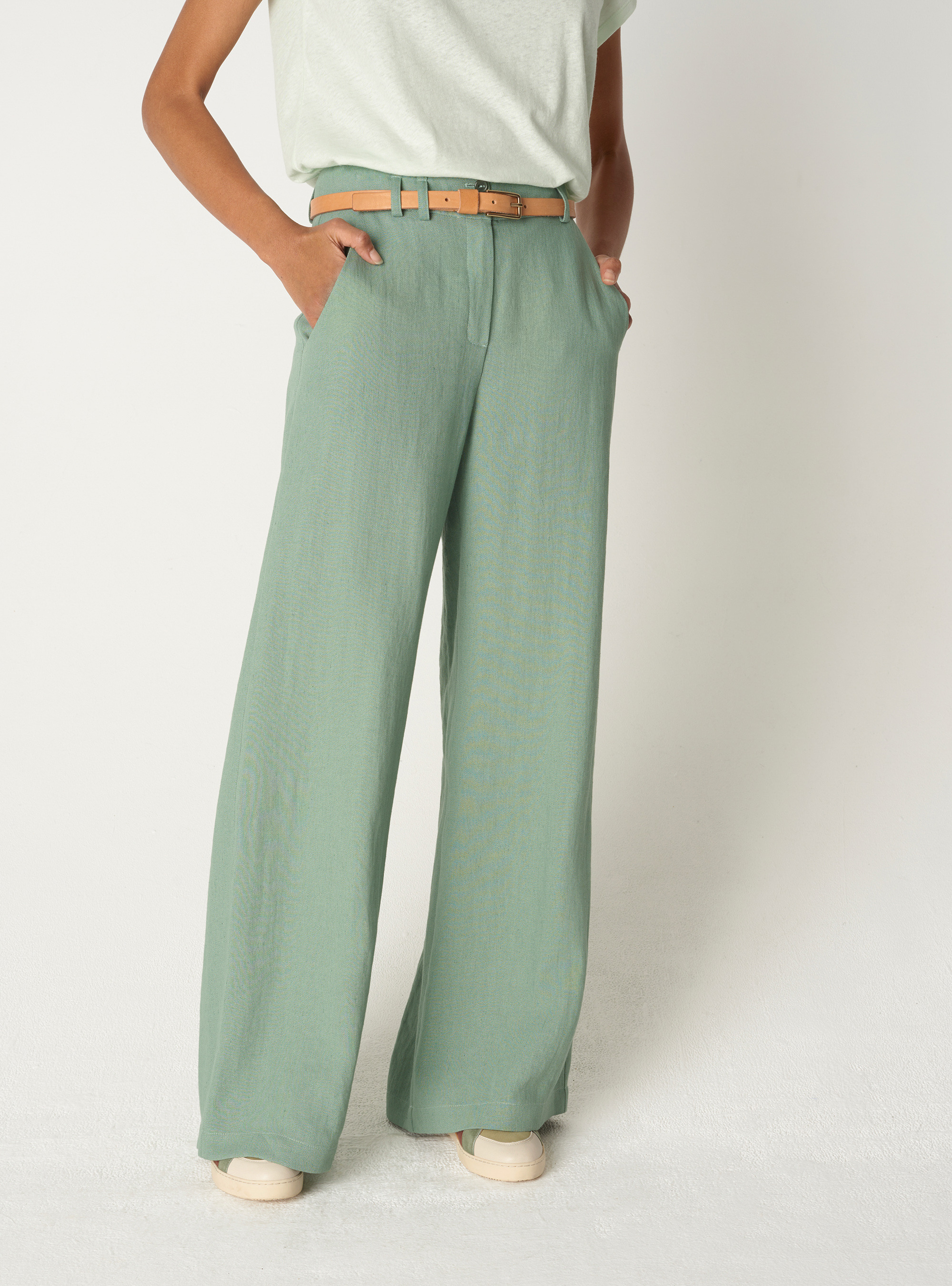 Le tissu principal est composé à 67% de lin et 33% de viscose, avec une doublure 100% coton. Pour préserver la qualité et la tenue du pantalon, un lavage délicat à 30 degrés est recommandé, sans blanchiment ni sèche-linge. Le repassage doit se faire à fer doux, et un nettoyage à sec est possible avec tous solvants.