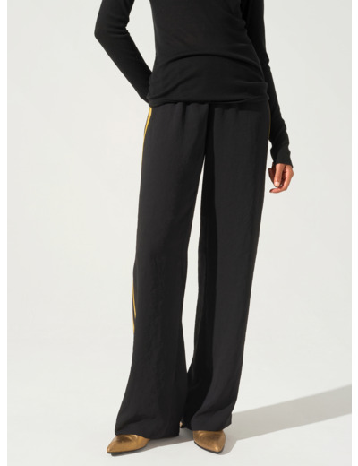 • Caractéristiques clés : Pantalon droit élastiqué à la taille type smocks. Bandes en contraste de couleur lui conférant une allure sport chic. Mix de matières contrastées : le crêpe polyester pour son côté mat, fluide et les bandes en cupro pour le côté satiné.