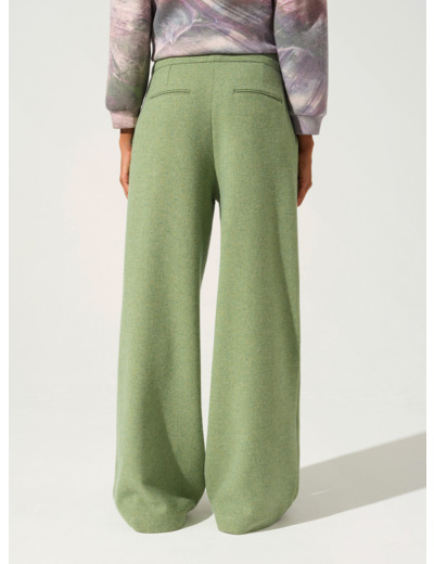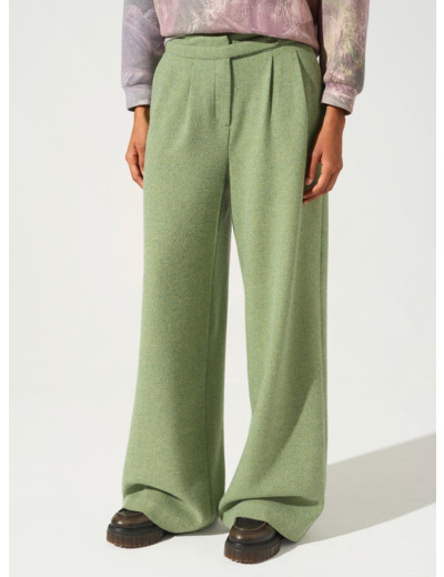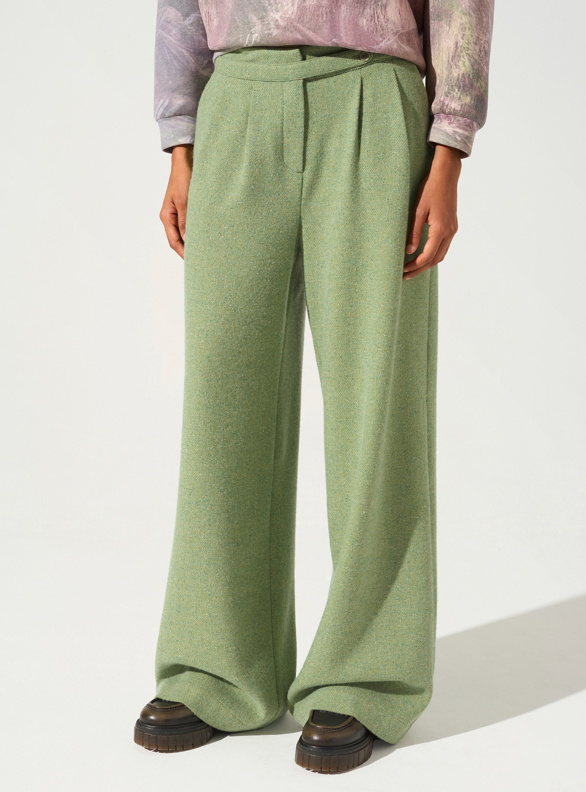 • Caractéristiques clés : Pantalon large à taille haute, ceinturée et boutonnée avec un bouton corozo ton sur ton. Une pièce élégante avec sa finition ceinture anglaise à l'intérieur à l'aide de notre doublure imprimée de la saison et ses plis couchés qui accentuent le volume de la silhouette, appuyée aux hanches et large dans le bas. Matière en joli lainage mélangé avec aspect moucheté.