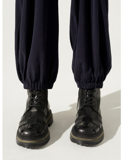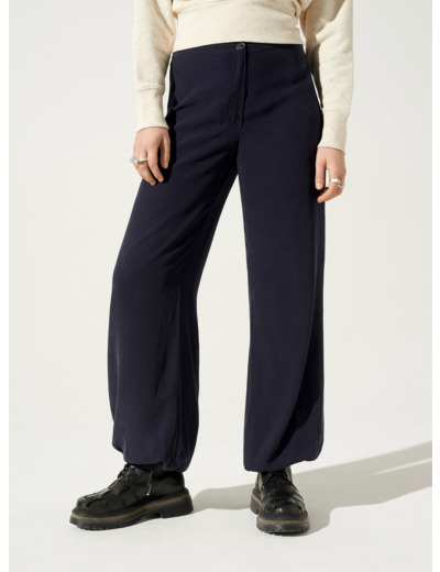 • Caractéristiques clés : Pantalon appuyé aux hanches, large sur les jambes et élastiqué dans le bas. Tissu fluide avec un toucher et un aspect soyeux, matière très douce agréable à porter particulièrement à la mi-saison.