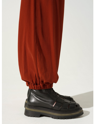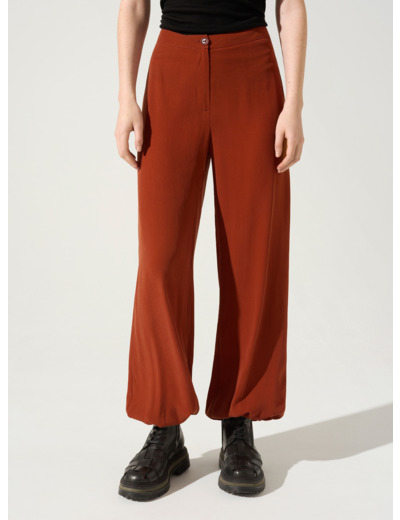 • Caractéristiques clés : Pantalon appuyé aux hanches, large sur les jambes et élastiqué dans le bas. Tissu fluide avec un toucher et un aspect soyeux, matière très douce agréable à porter particulièrement à la mi-saison.