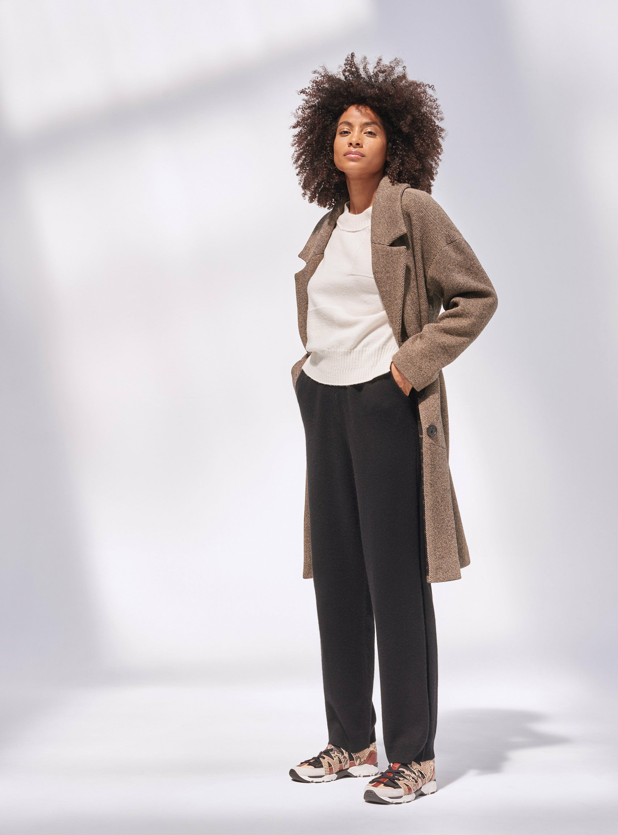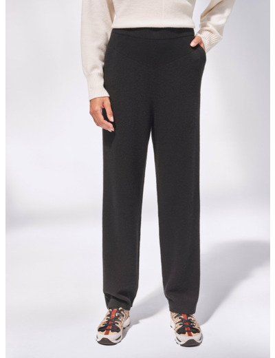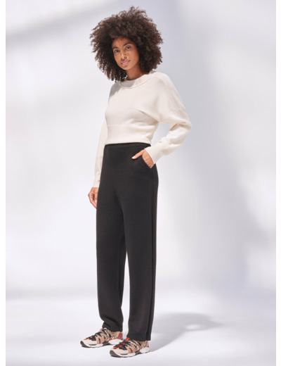 - Pantalon droit, légèrement loose, resserré dans le bas par un bord-côte