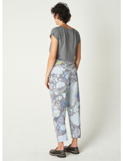 Ce pantalon se distingue par sa coupe loose qui se resserre subtilement en bas de jambe, accentuant la légèreté du mouvement. La ceinture à patte déportée apporte une touche d’originalité, tandis que les découpes avant et arrière dynamisent la ligne. L’imprimé exclusif "Rhythms", créé par le bureau de style Cotélac et imprimé localement à Ambérieu en Bugey, fait de ce modèle une pièce singulière et raffinée.