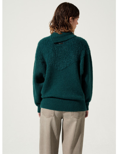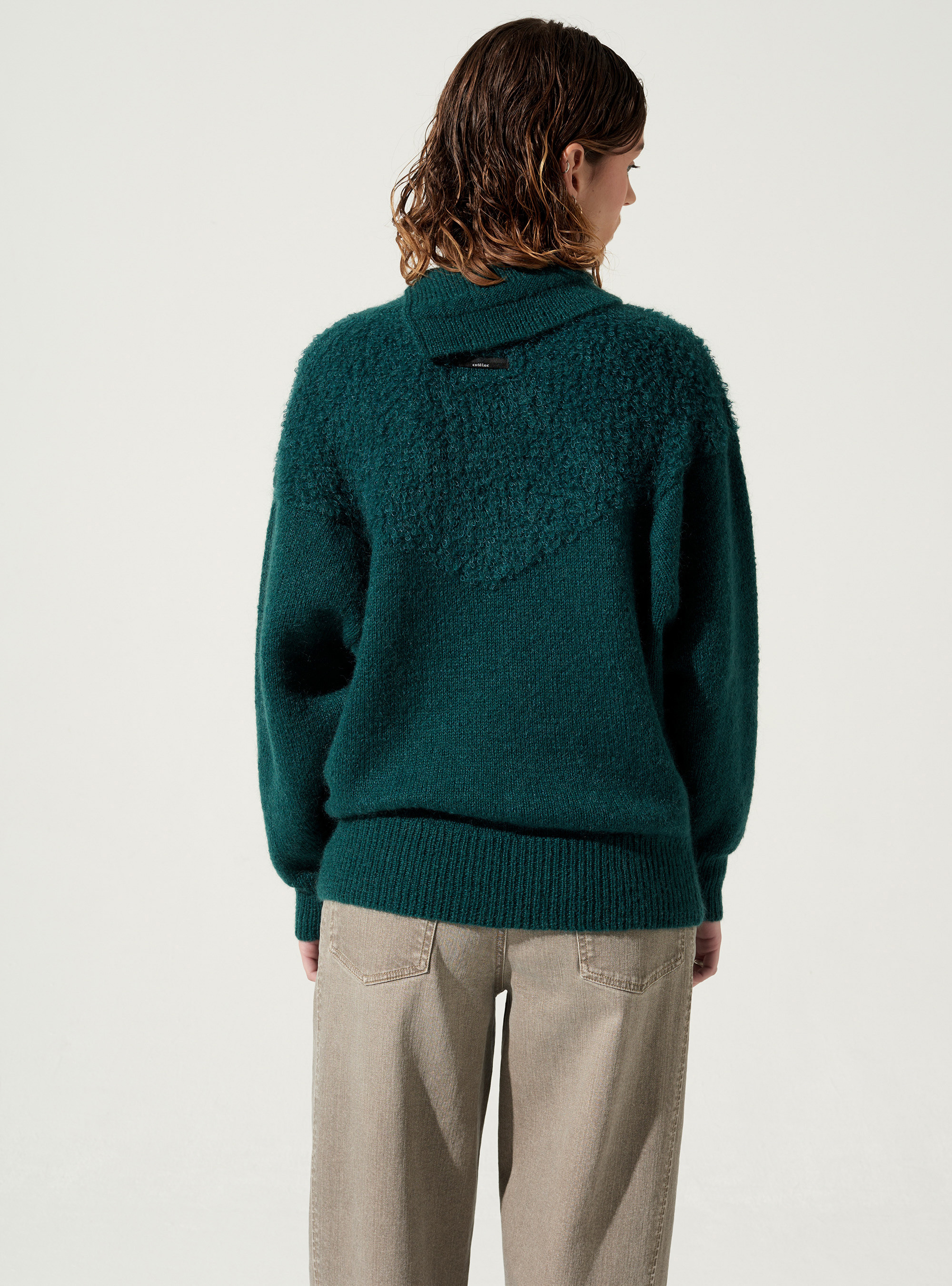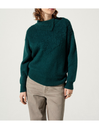 • Caractéristiques clés : Pull au col montant fendu avec plastron en pointe en point bouclette. Volume ample et court resserré dans le bas par des bord-côtes et emmanchures descendues fantaisies. Matière aérée et naturelle.