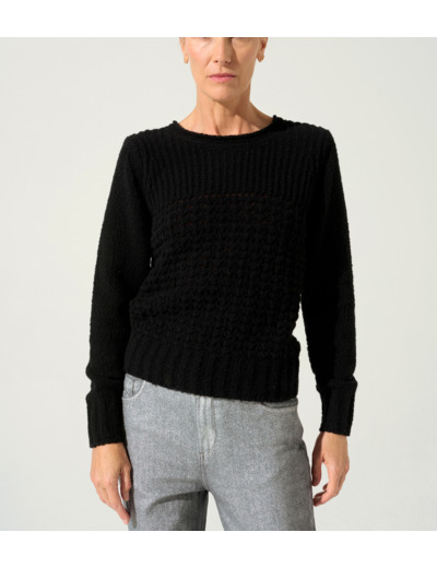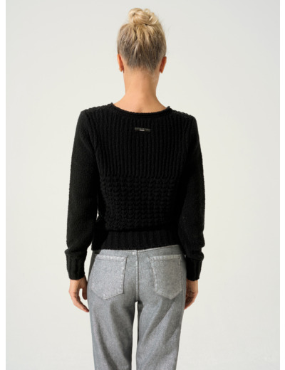 • Caractéristiques clés : Pull à l'encolure ronde en matière mousseuse, douce et légèrement poilue, irrégulière et chaude. Encolure ronde, petit buste qui souligne la taille et manches larges resserrées aux poignets. Point fantaisie façon macramé mélangé.