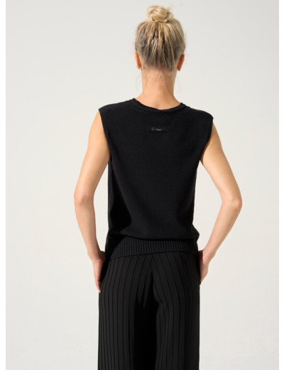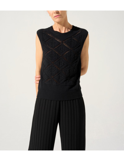 • Caractéristiques clés : Pull esprit débardeur à encolure ronde avec des détails de points de crochet sur le devant. Idéal sur une chemise unie pour les journées plus fraîches.