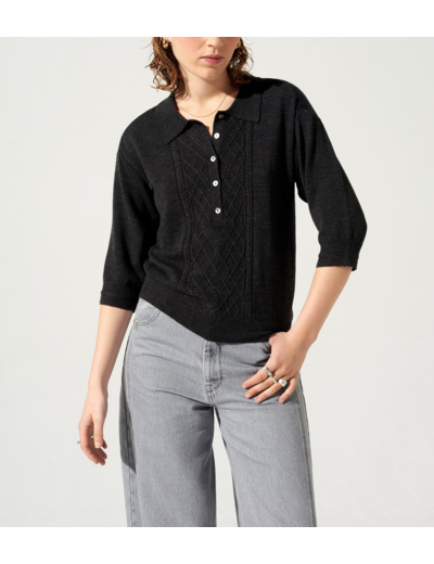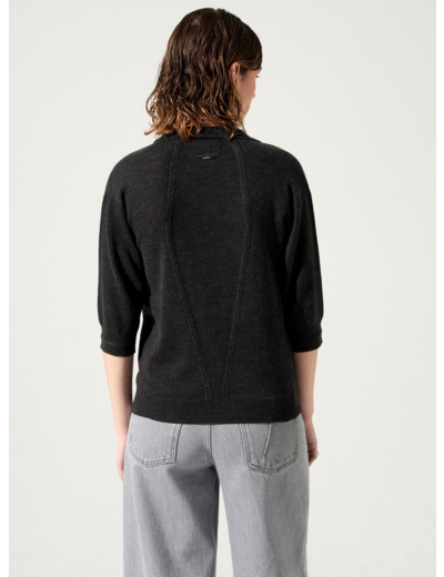• Caractéristiques clés : Pull à l'encolure polo et aux manches courtes aux emmanchures descendues. Volume ample légèrement trapèze, en matière douce, confortable et chaude avec un mélange de points raffinés, torsades et jersey, emblématique de la Maison.