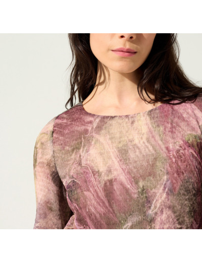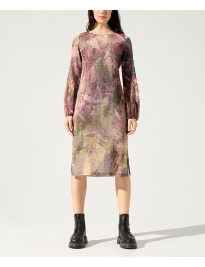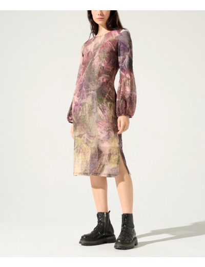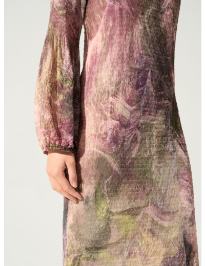 • Caractéristiques clés : Robe près du corps longueur sous genoux, fendue sur les côtés pour un meilleure mouvement. Ses manches longues bouffantes sont resserrées par un élastique au niveau des poignets et sont transparentes. L'ensemble du corps de la robe est en voile de polyester cloqué et bouillonné dans notre atelier d'Ambérieu-en-Bugey, doublé en jersey. Main mousseuse très agréable à porter et imprimé maison élaboré par notre Bureau de style.
