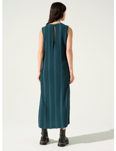 • Caractéristiques clés : Robe droite à l'encolure ronde ouverte dans le dos par une grande goutte boutonnée en nacre naturelle. Sa longueur mi-mollets et ses grandes fentes sur les côtés en font une pièce facile à porter. Doublée avec une fine charmeuse en maille douce et confortable.