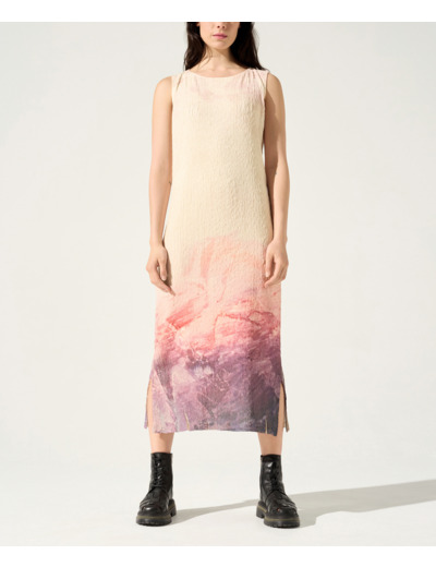 • Caractéristiques clés : Robe tube longueur mi-mollets fendue sur les côtés et doublée en jersey. Sa coupe près du corps met en valeur la silhouette. Procédé de plissé bouillonné savoir-faire de la Maison et sublimation effectuée pièce par pièce dans notre atelier d'Ambérieu en Bugey.