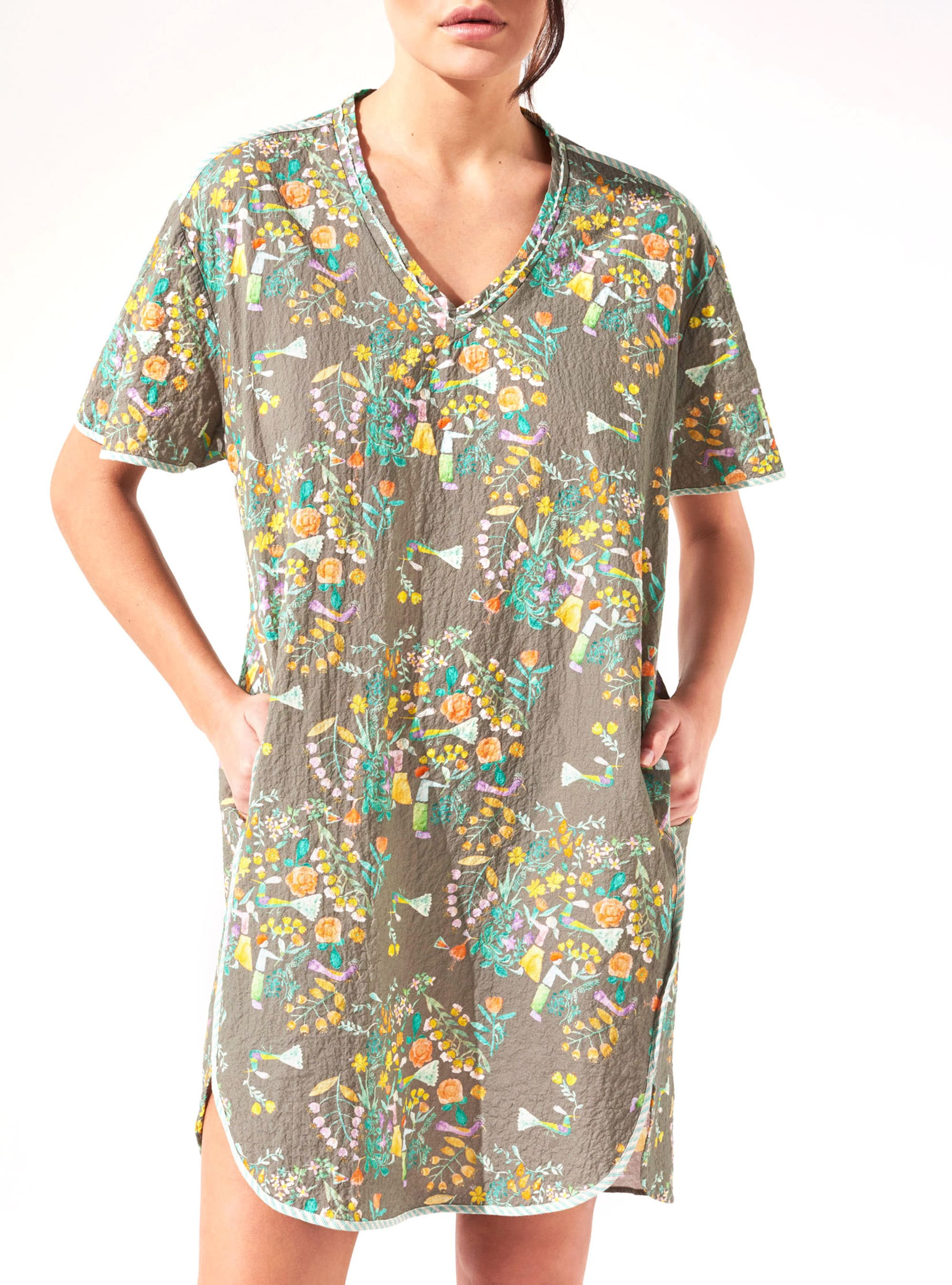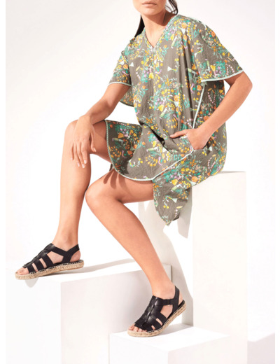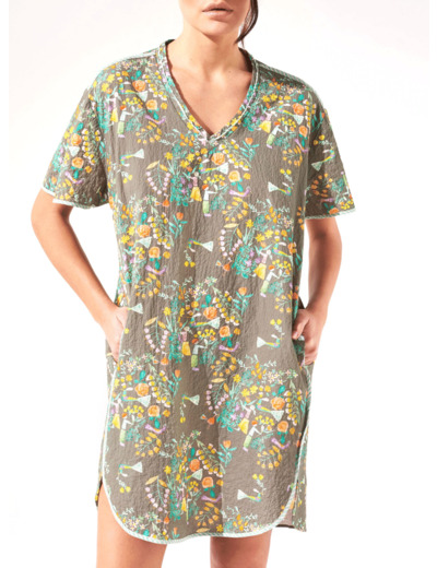 • Caractéristiques clés : L'esprit baroudeur de la femme Cotelac revient dans cette robe ample imprimée au motif exclusif 'Robe Blush' dessiné par nos stylistes- Robe ample droite esprit robe t-shirt- Longueur dessus genoux- Manches courtes- Poches côtés - Encolure en V- Plus longue derrière que devant avec ourlet arrondi- Liserés à cru et biais contrastants dans les découpes bas de manches et encolure- Non doublée(volume ample)