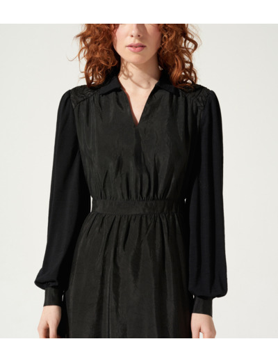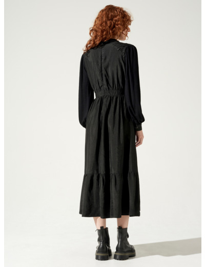 • Caractéristiques clés : Robe longue ajustée à la taille par une découpe ceinturée, dont la jupe est bordée par un volant dans le bas et à l'encolure en V sur le devant. Manches longues légèrement bouffantes, resserrées aux poignets par un bouton de nacre. Zip invisible dans le dos pour un enfilage optimal. Cette robe est constituée de trois matières différentes : le jersey de laine pour son confort et sa chaleur, le cupro pour sa fluidité et son aspect légèrement satiné et enfin le polyester pour sa technicité et le raffinement de son plissage permanent.