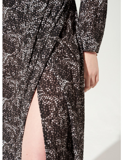 • Caractéristiques clés : Robe près du corps dans le haut et évasée dans le bas. Encolure montante froncée sur un côté et petites ganses élastiquées au niveau du col. Zip invisible dans le dos, agrémenté de boutons en nacre naturelle. Manches fendues et boutonnées au niveau des poignets. Plis couchés sur le côté gauche des hanches. Polyester cloqué avec une main naturelle et procédé d'écrasement effectué pièce par pièce selon notre savoir-faire dans notre atelier d'Ambérieu en Bugey.