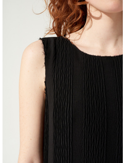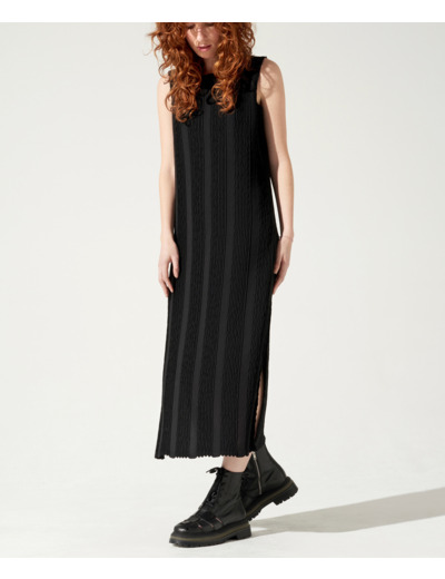 • Caractéristiques clés : Robe droite à l'encolure ronde ouverte dans le dos par une grande goutte boutonnée en nacre naturelle. Sa longueur mi-mollets et ses grandes fentes sur les côtés en font une pièce facile à porter. Doublée avec une fine charmeuse en maille douce et confortable.