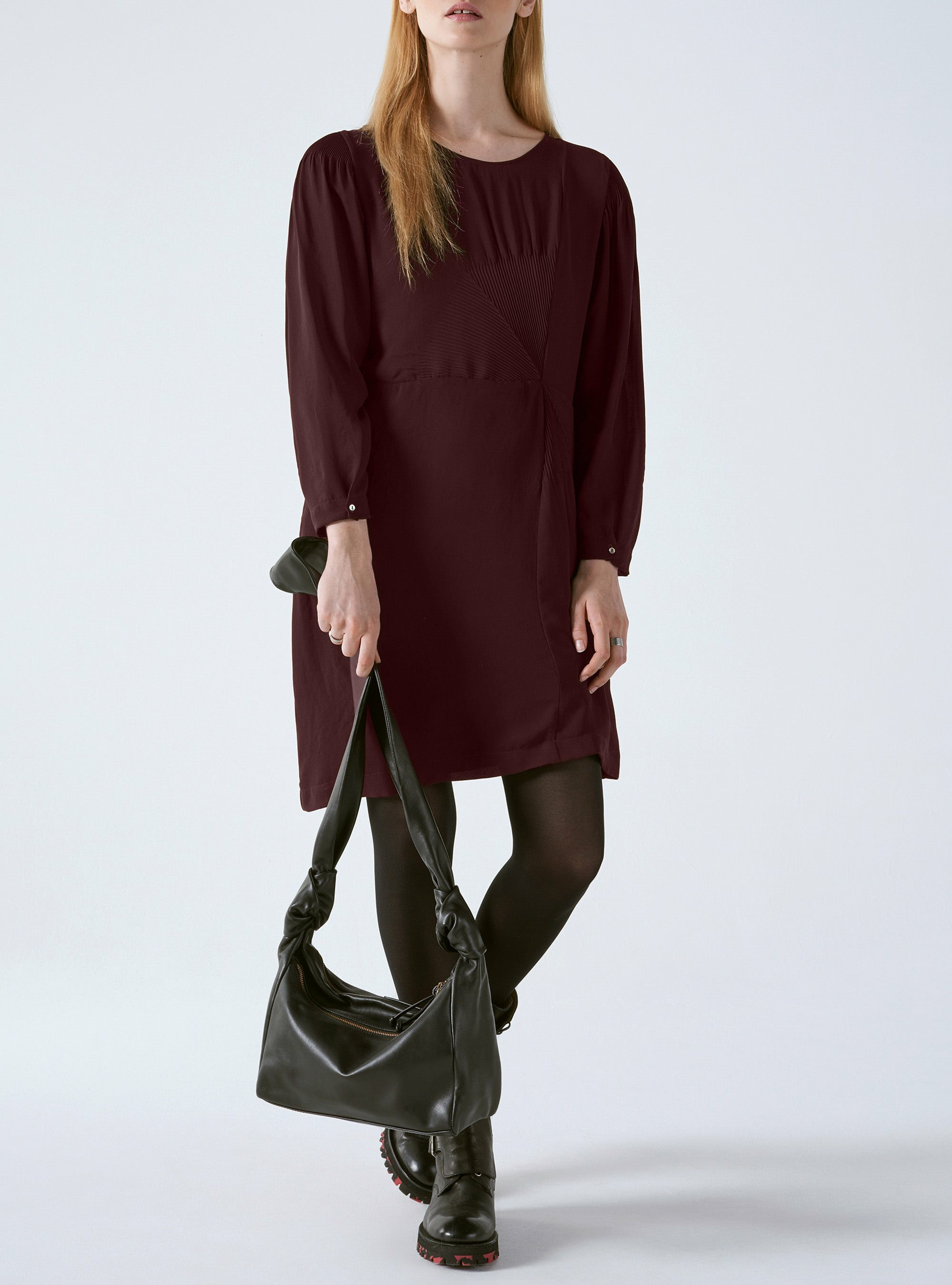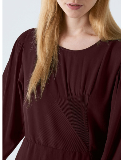 - Manche longues, légèrement bouffantes, resserrées dans le haut par un plissé cristal et fermées dans le bas par un bouton nacre