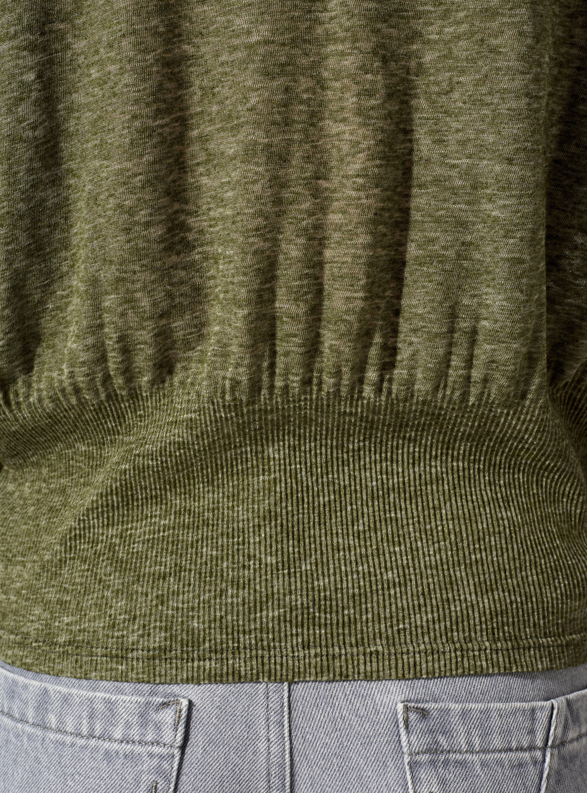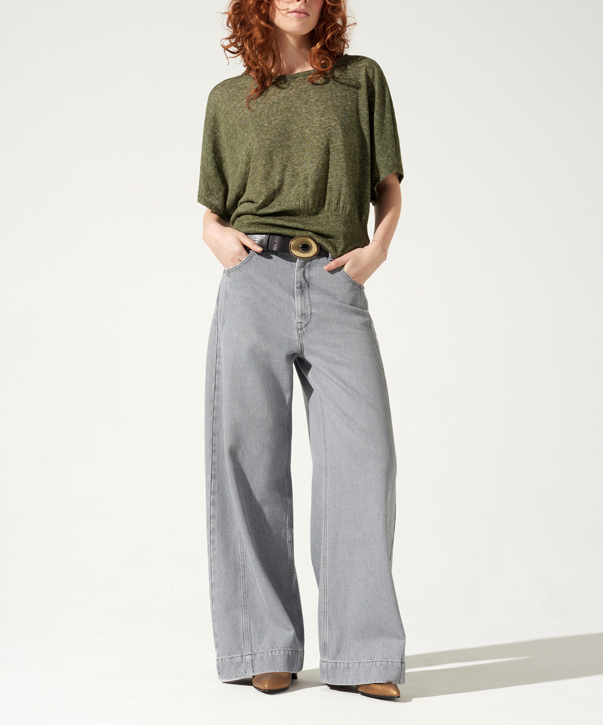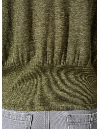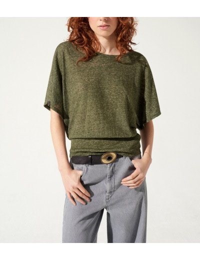 • Caractéristiques clés : T-shirt à manches courtes à l'encolure esprit bateau. Sa matière, mélange de lin flammé et de polyester, allie le confort d'une matière naturelle à la technicité du polyester. Ses emmanchures descendues offrent un confort optimal tout comme son volume ample resserré à la taille par un plissé cristal réalisé pièce par pièce dans notre atelier d'Ambérieu en Bugey.