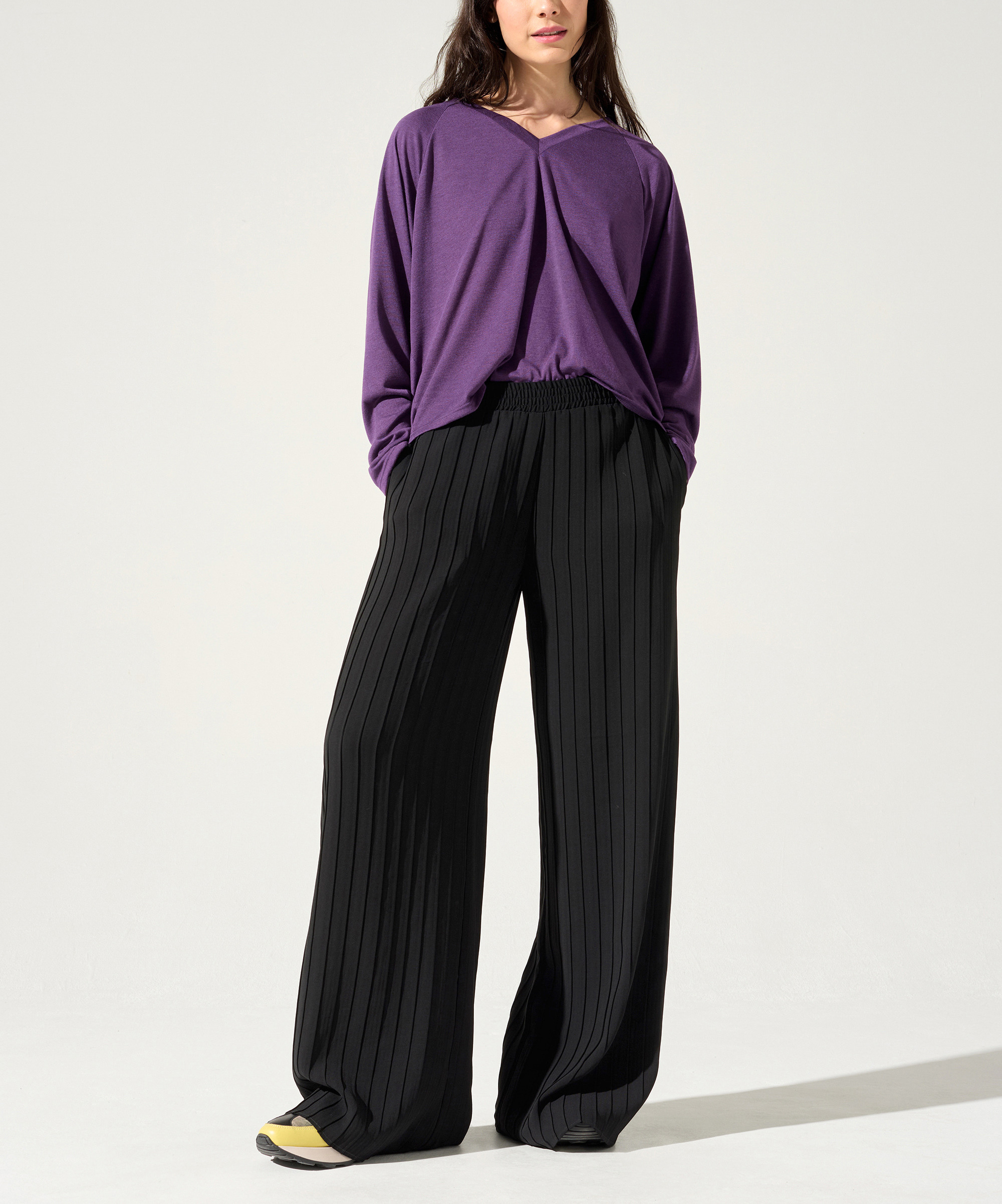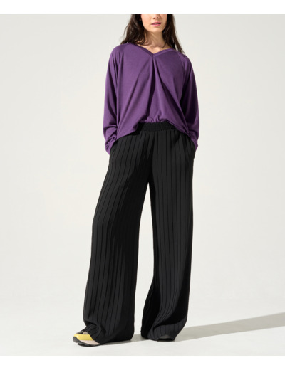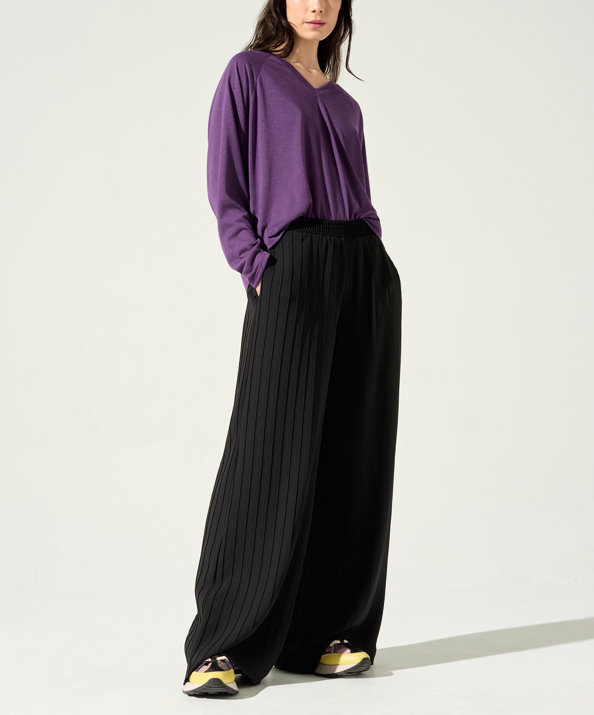 • Caractéristiques clés : T-shirt à manches longues et encolure en V. Matière douce et confortable : la viscose lui donne toute sa fluidité tandis que le polyester nous permet de procéder au plissage du cristal. Découpe dos soulignée par un plissé cristal effectué pièce par pièce dans notre atelier d'Ambérieu en Bugey.
