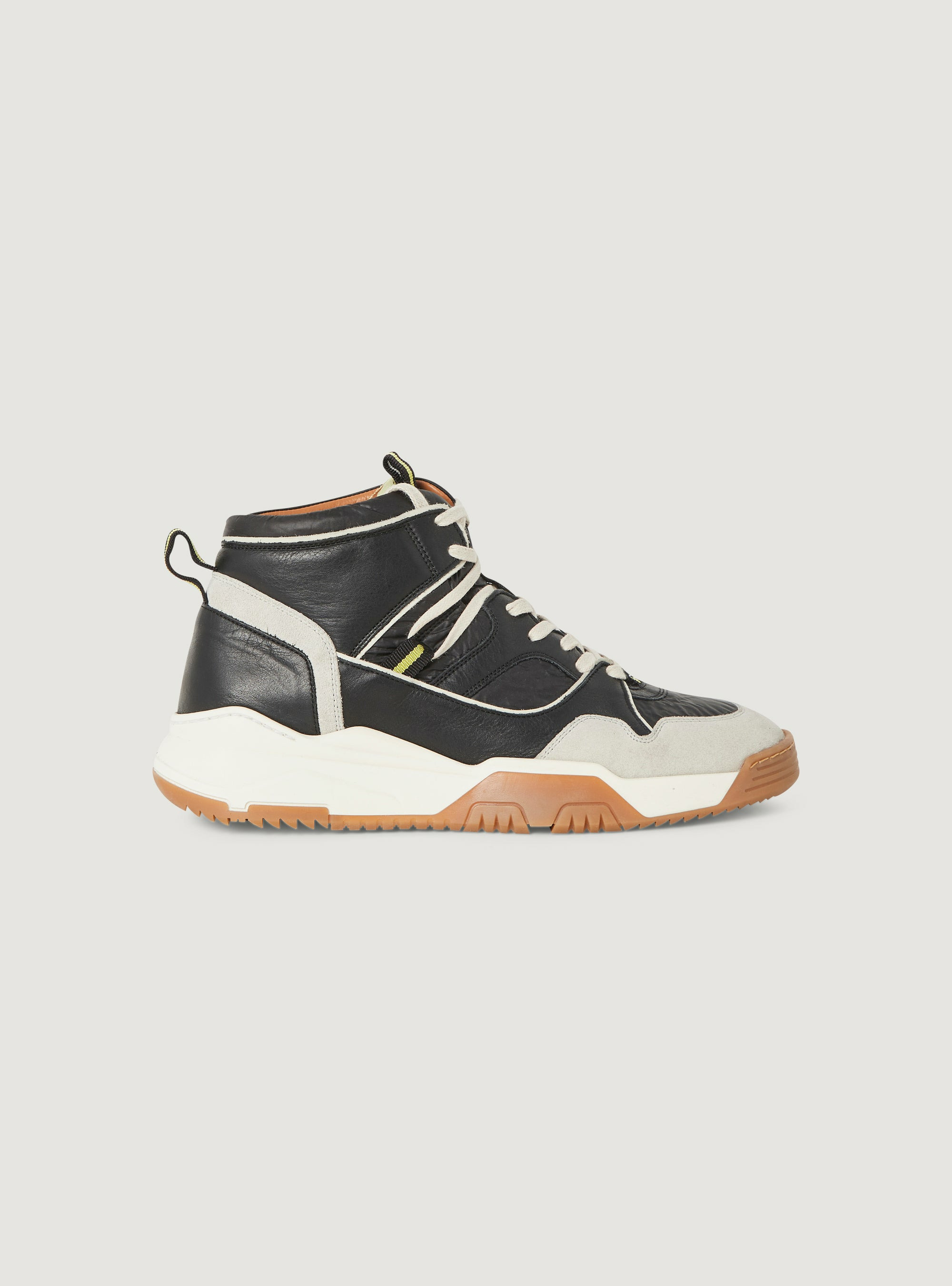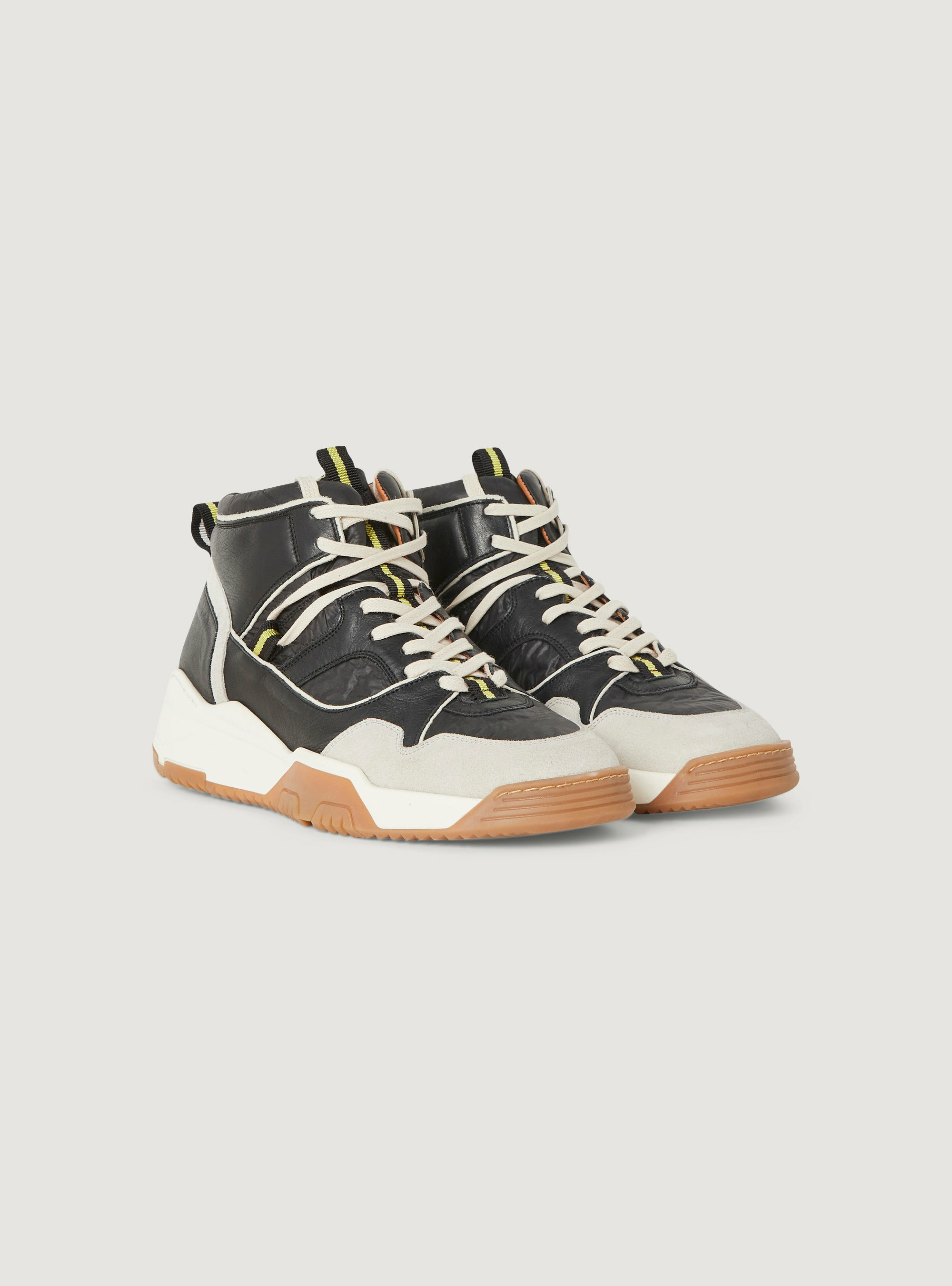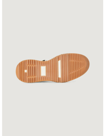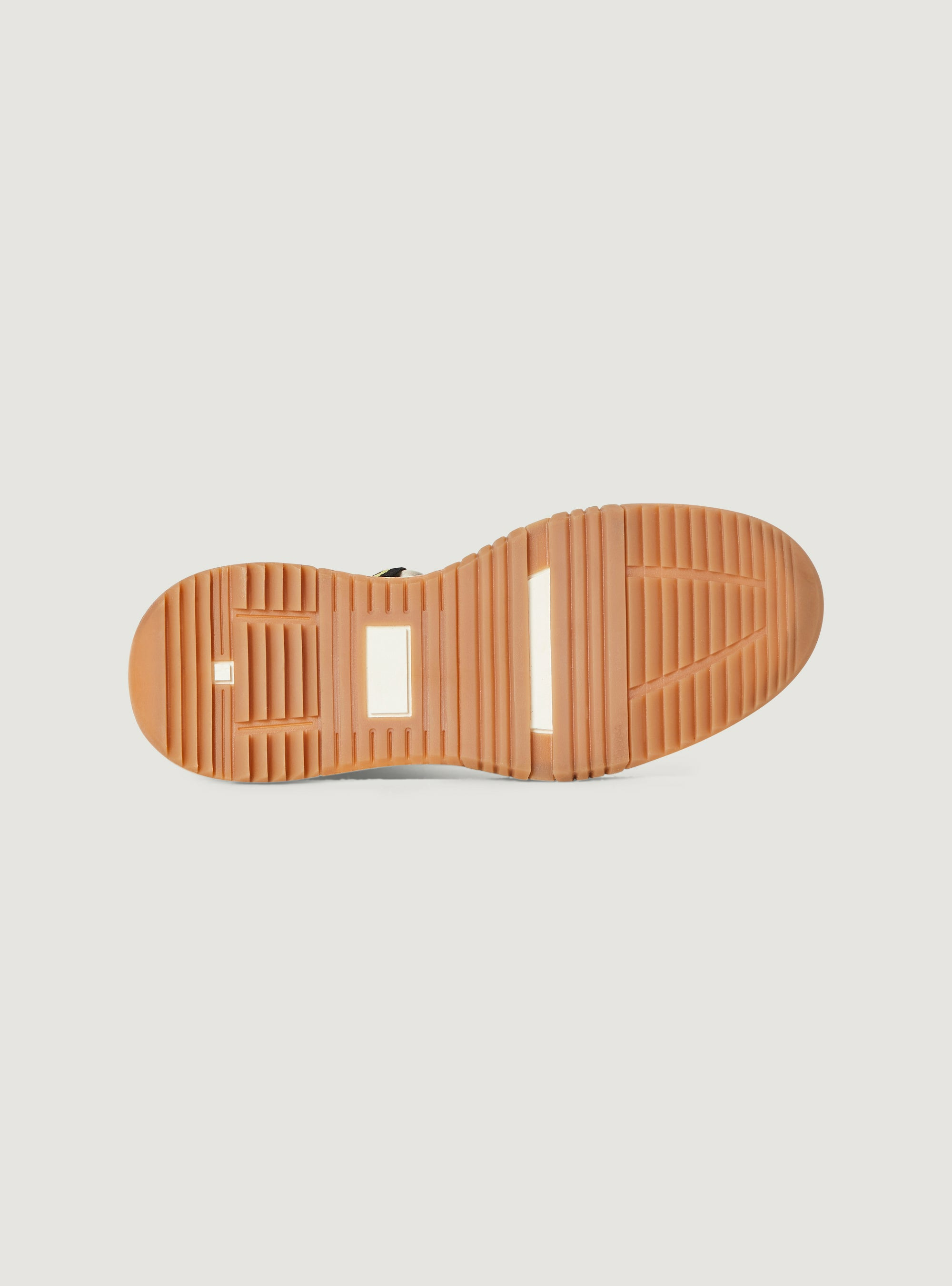• Caractéristiques clés : Sneakers montantes faites de patchwork de cuirs lisses, velours et de tissu technique. Arrière avec mousse pour plus de confort. Talon de 3,5 cm pour une cambrure de 1,5 cm.