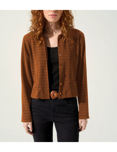 • Caractéristiques clés : Veste carrée au petit col chemise avec boutonnage en nacre naturelle ton sur ton et poches plaquées sur le devant.