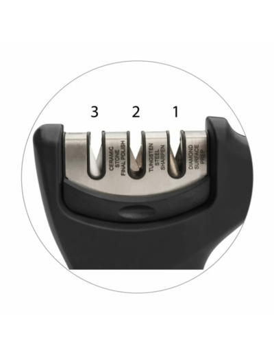 Comment utiliser l’aiguiseur 3 en 1 ? Passez la lame dans chaque fente selon l’ordre indiqué, en appliquant une pression modérée.