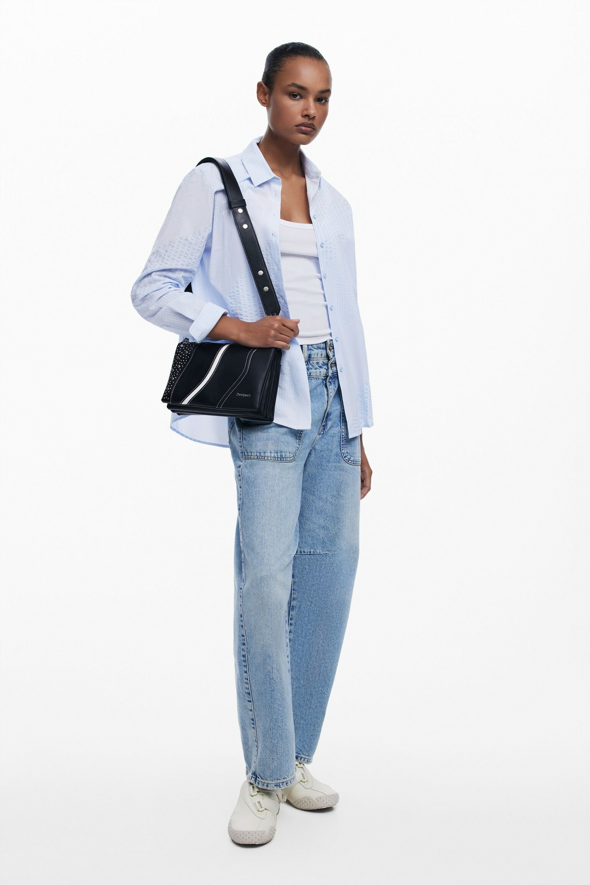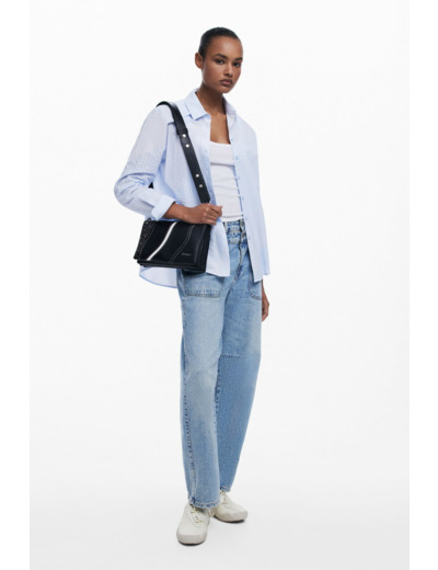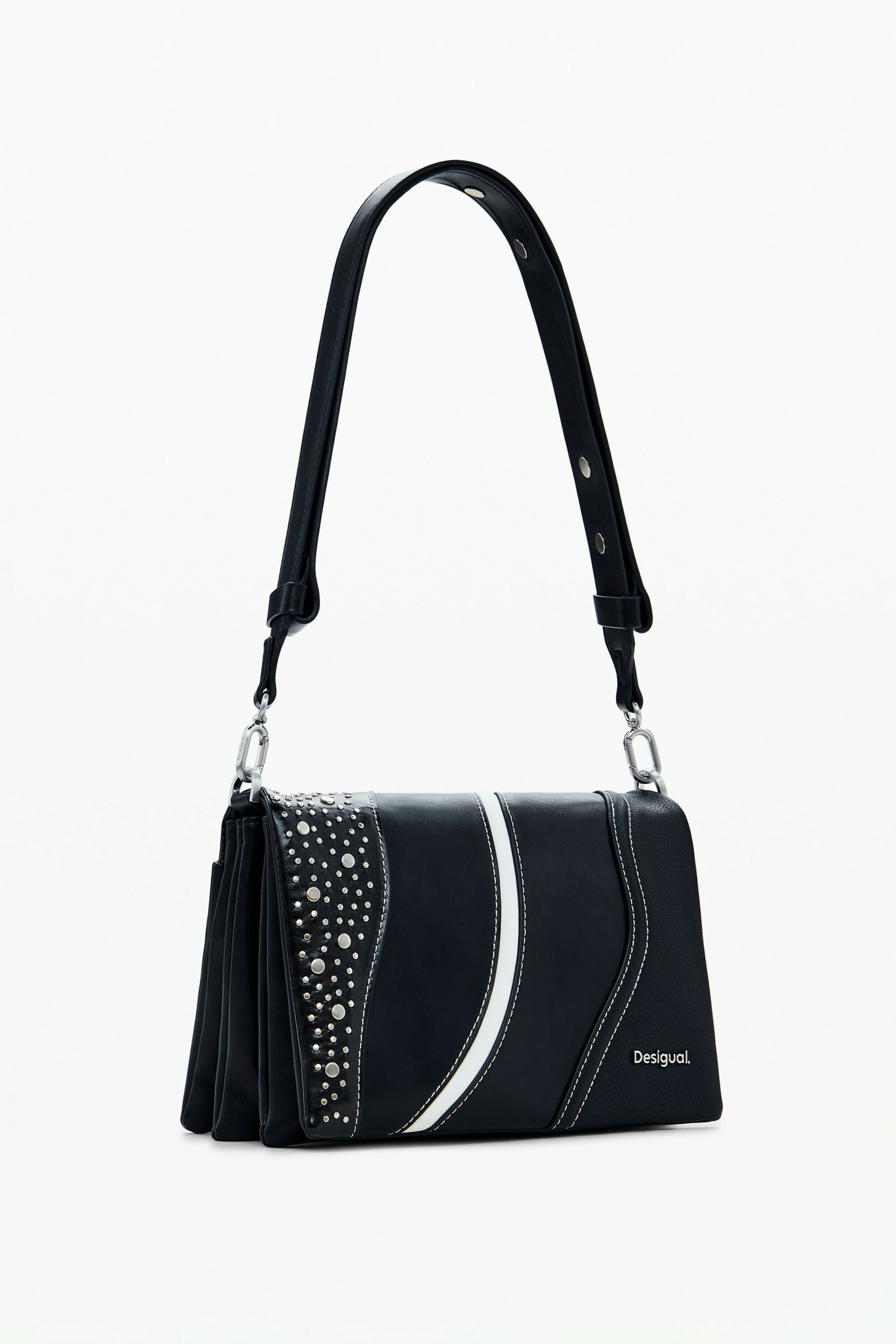 Adoptez l’allure urbaine et sophistiquée avec cette bandoulière en effet cuir signée Desigual. Son design audacieux, rehaussé de clous et de surpiqûres contrastées, affirme votre style avec caractère.