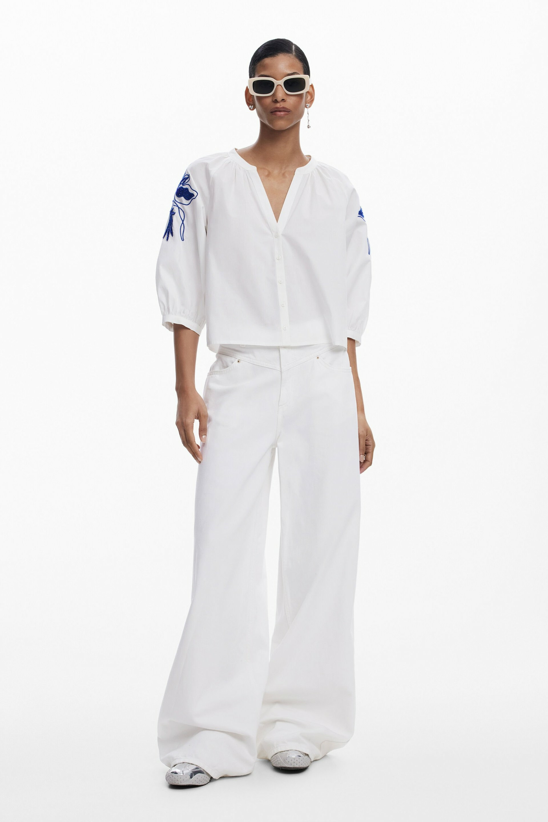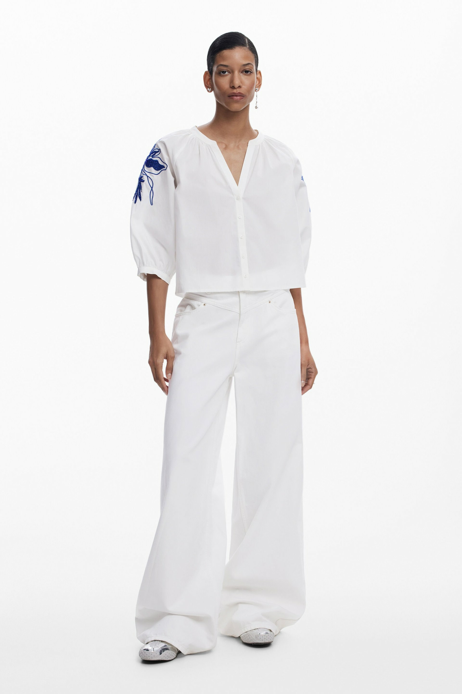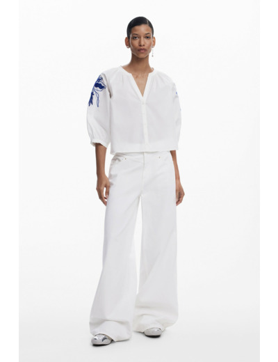 Sublimez votre allure avec cette blouse à manches trois-quarts bouffantes, où élégance et originalité se rencontrent. Les détails floraux monochromes apportent une touche artistique discrète, parfaite pour affirmer votre style avec subtilité.
