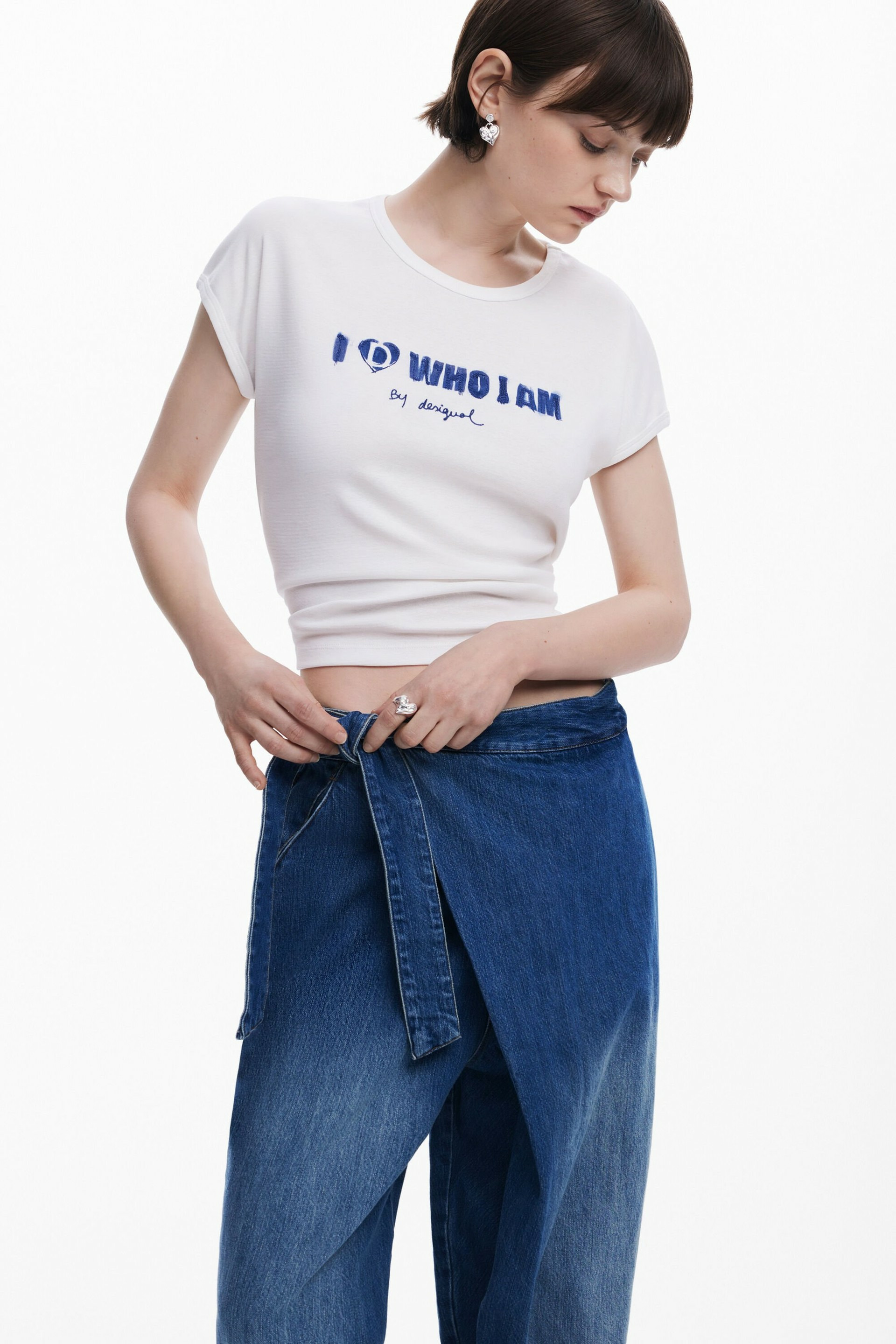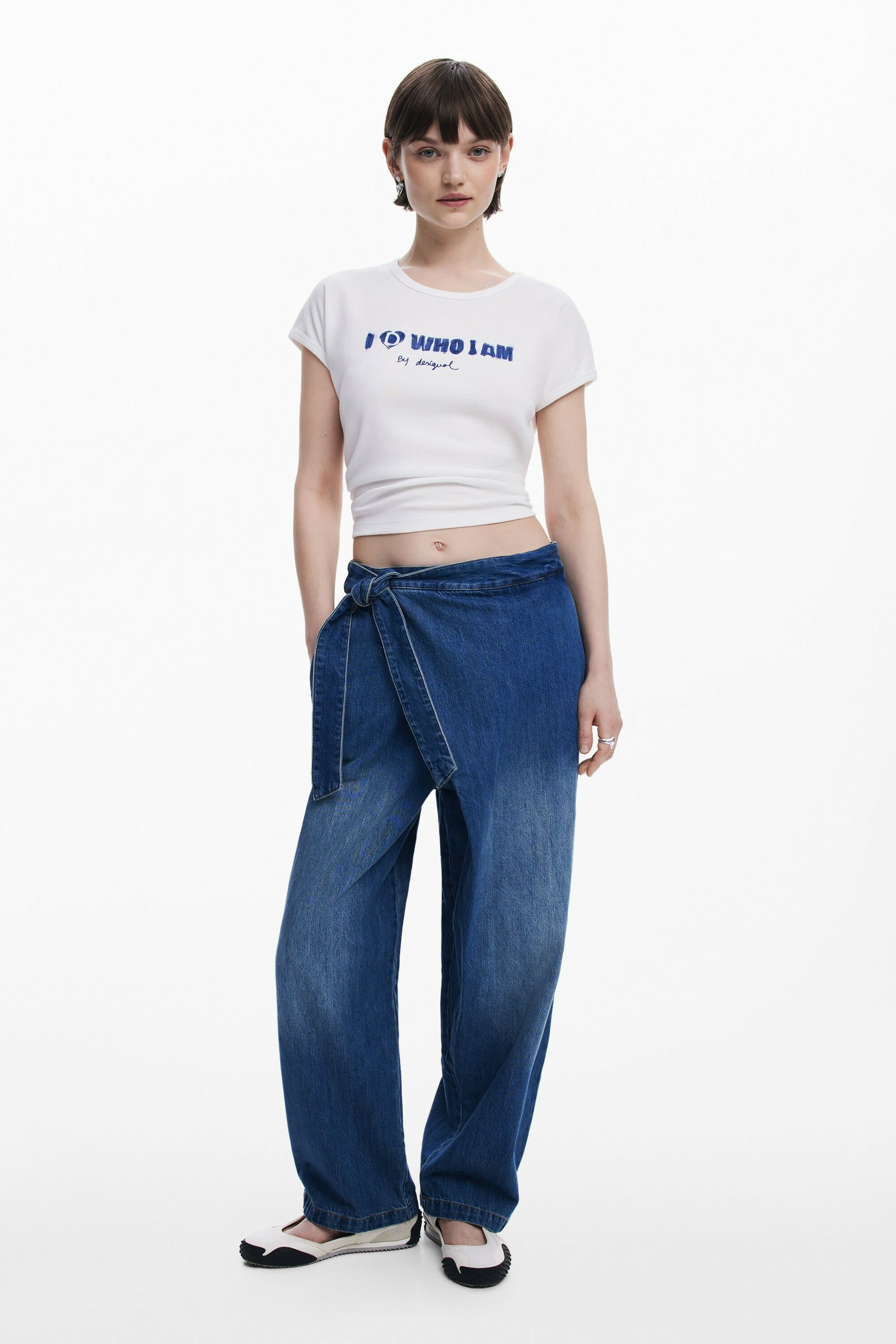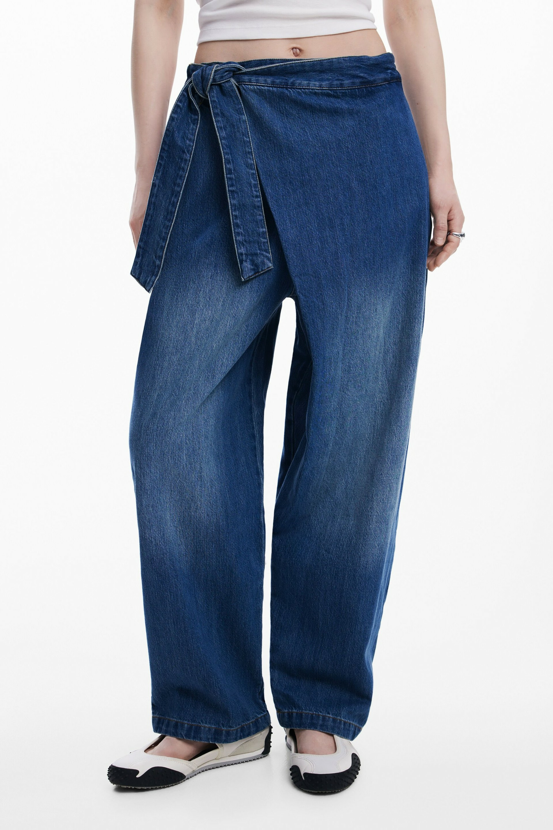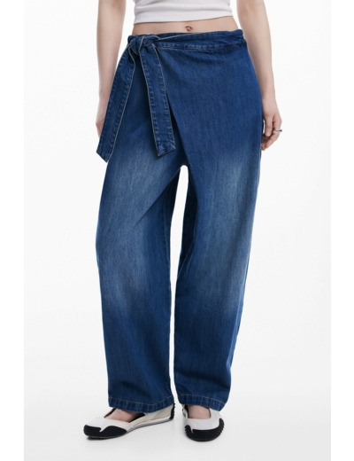 Adoptez l’allure décontractée et audacieuse du jean long style baggy signé Desigual. Sa coupe ample et son effet usé apportent une touche contemporaine à votre garde-robe, tandis que le devant croisé et le lien façon paréo réinventent le denim classique avec originalité.