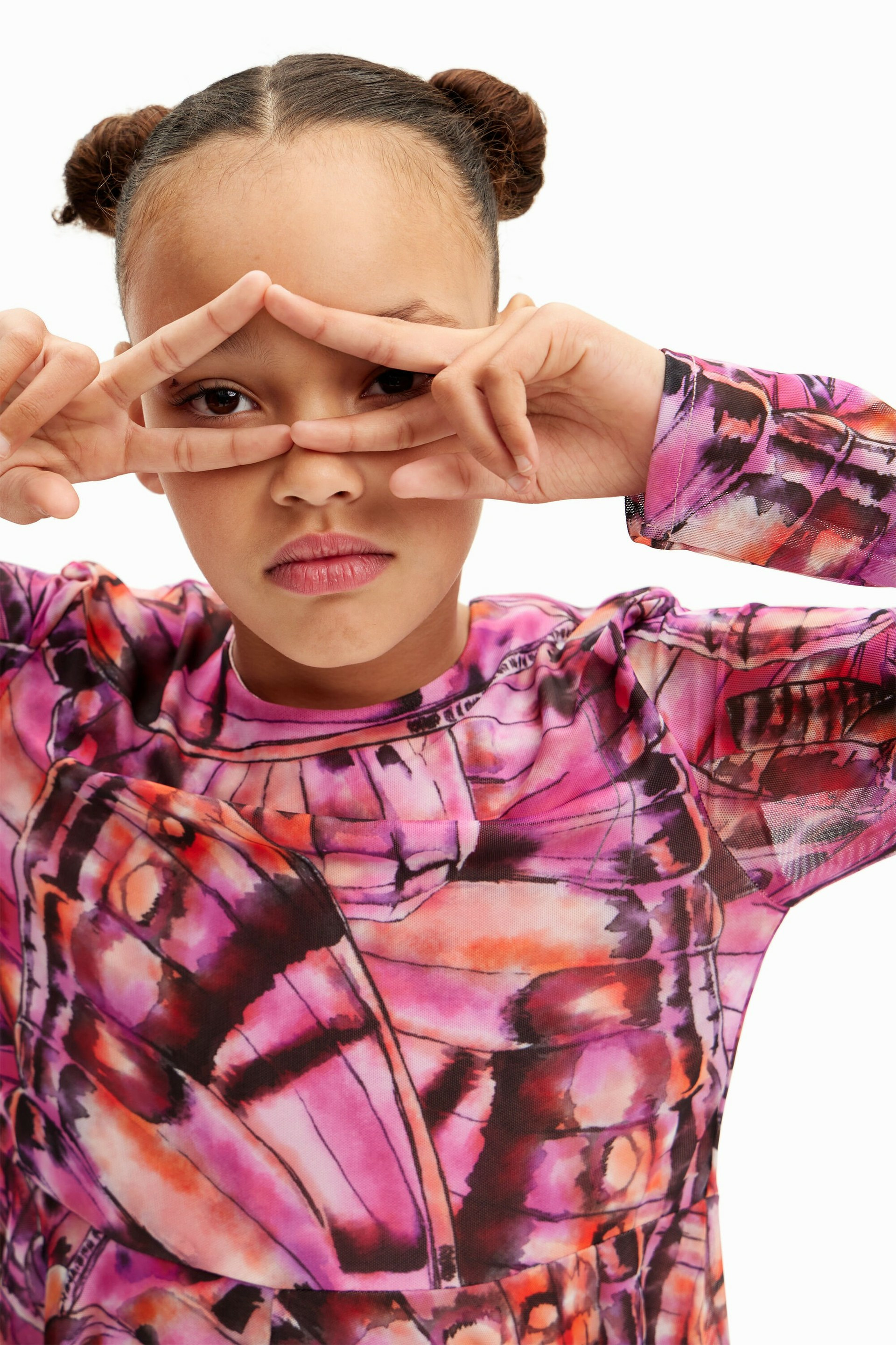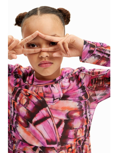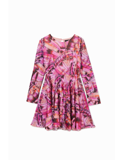 Sublimez votre silhouette avec cette robe courte à manches longues, où le col rond classique rencontre une jupe évasée ornée d’un imprimé délicat d’ailes de papillon. Une pièce unique signée Desigual qui allie élégance et originalité.