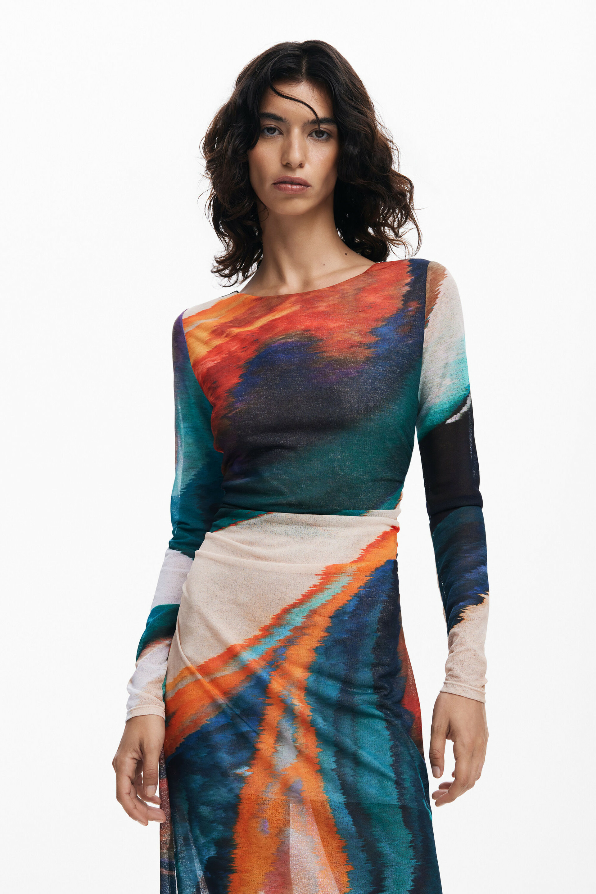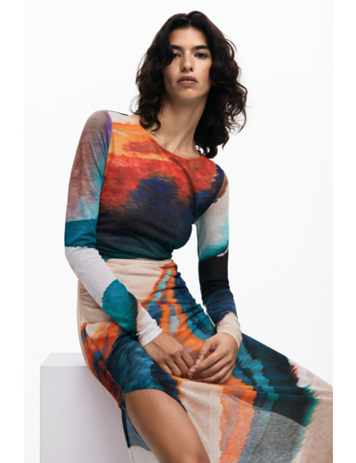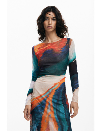 Affirmez votre style avec cette robe longue à manches longues signée Desigual, où l’imprimé coloré dynamise chaque mouvement. Une pièce unique qui transforme votre allure en une déclaration vibrante et élégante.