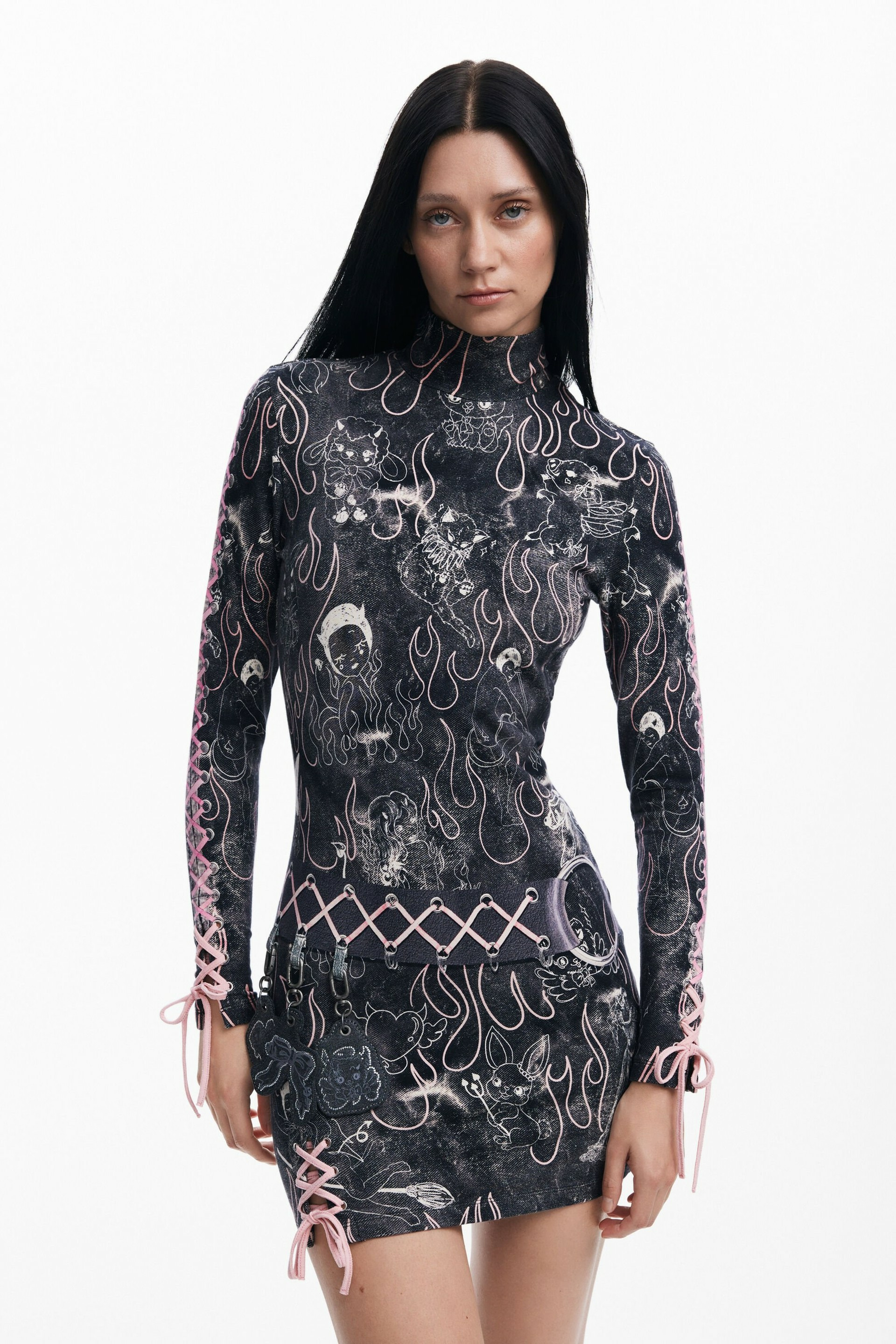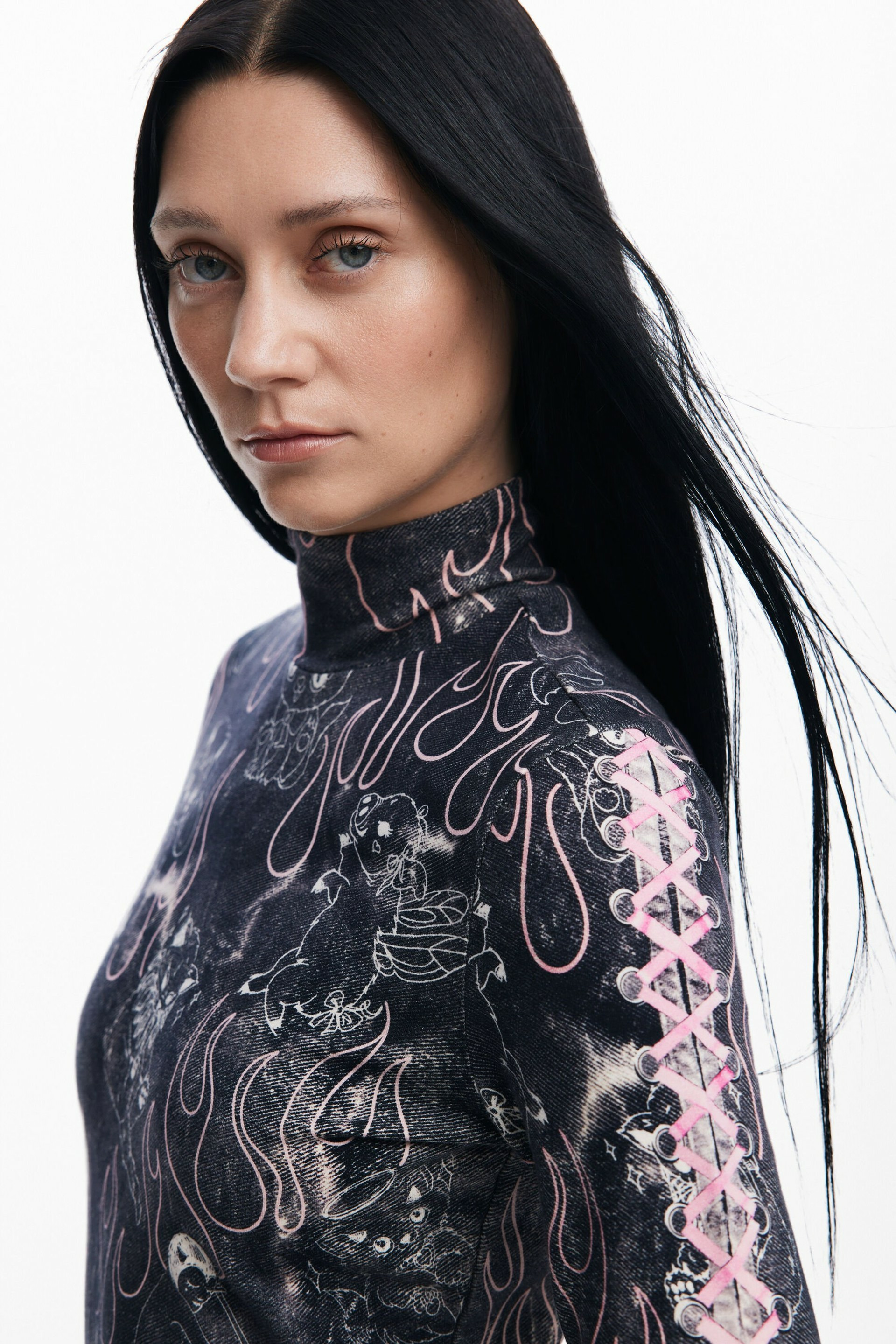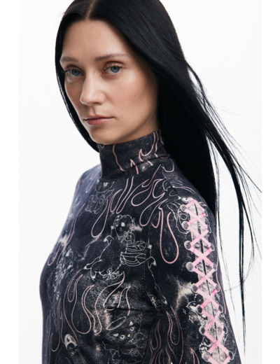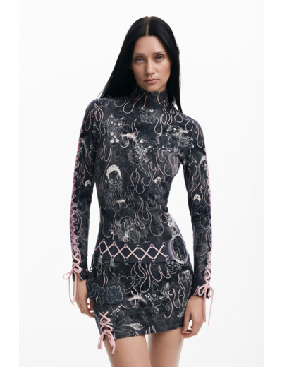 Affirmez votre style avec cette robe mini slim à col montant, signée María Escoté, où l’audace rencontre l’élégance urbaine. Son effet usé et ses détails de nœuds apportent une touche unique et contemporaine à votre silhouette.