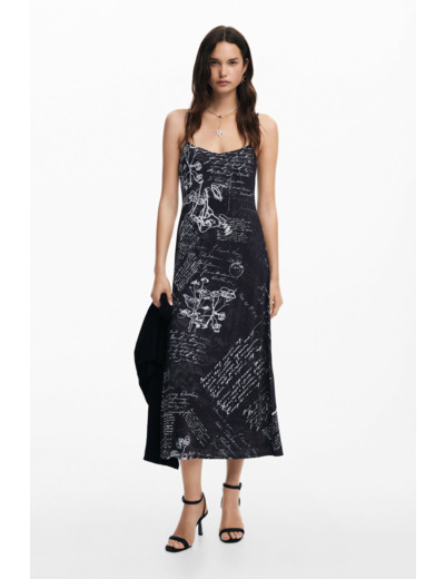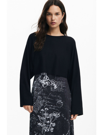 Affirmez votre style avec cette robe midi qui marie élégance et originalité. Le contraste entre le haut uni aux manches bouffantes et la jupe plissée ornée d’imprimés floraux et textuels crée un équilibre parfait entre sobriété et audace.