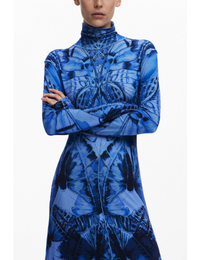 Réponse. Cette robe est conçue dans un tissu léger et confortable, typique des créations Desigual, assurant douceur et durabilité.