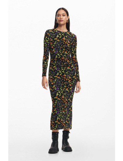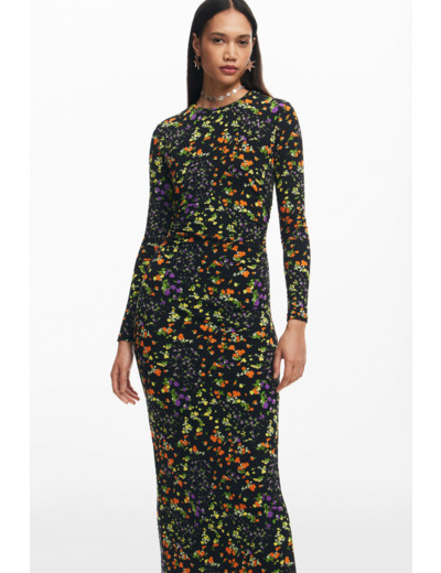 Affirmez votre élégance avec cette robe longue slim à manches longues, sublimée par un col roulé et un imprimé floral délicat. Une pièce qui allie confort et style pour une silhouette élancée et féminine.