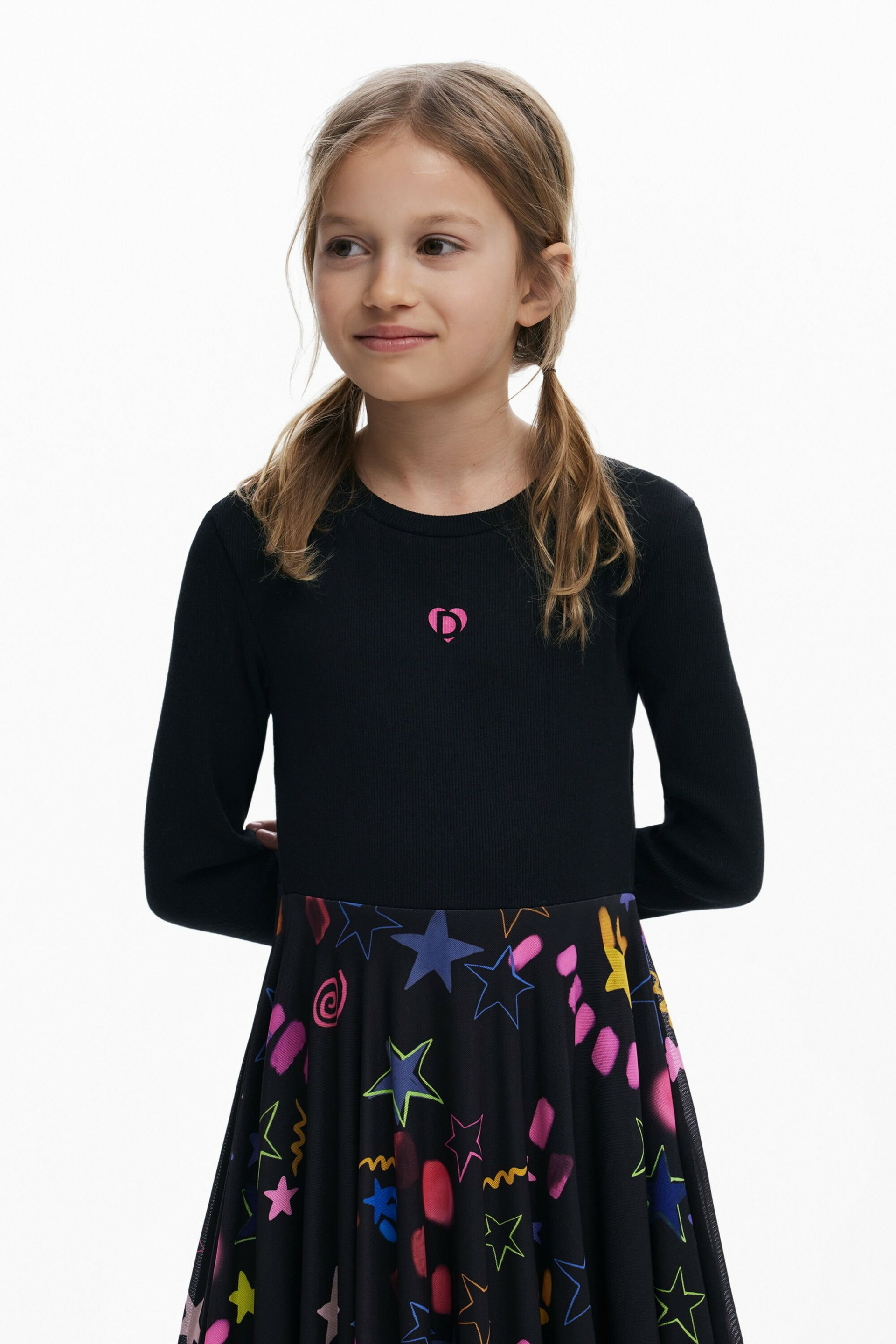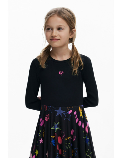 La robe combine un haut manches longues ajusté et une jupe en tulle légère, créant un contraste subtil entre structure et fluidité. L’imprimé étoiles, finement travaillé, apporte une touche de fantaisie élégante, idéale pour vos soirées ou événements spéciaux. Son design signé Desigual incarne l’originalité et le savoir-faire, pour une allure à la fois sophistiquée et décontractée.