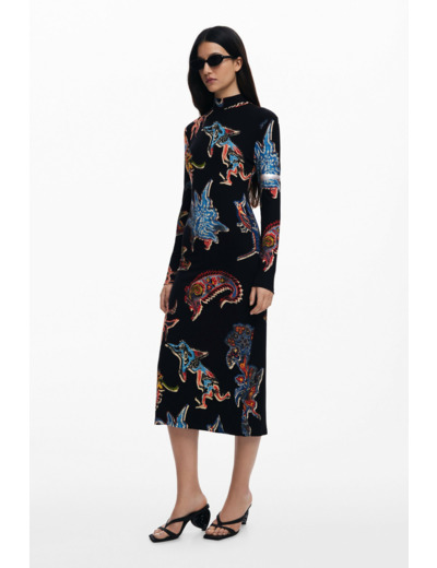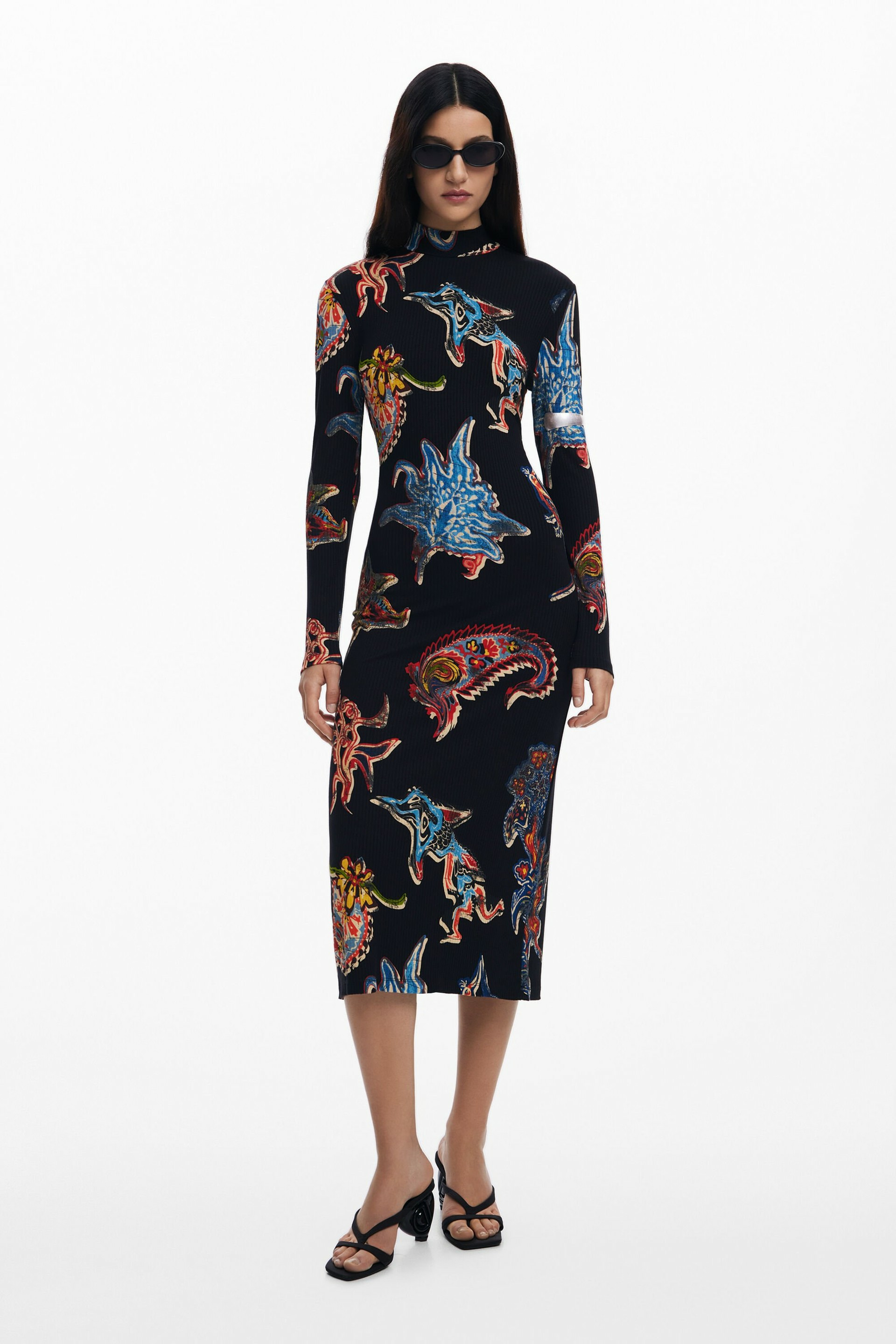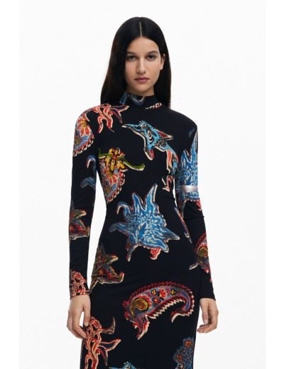 Conçue pour épouser parfaitement la silhouette, cette robe à manches longues et col montant joue sur la finesse de sa maille côtelée. Son imprimé paisley apporte une touche artistique et sophistiquée, caractéristique du savoir-faire Desigual. Facile à porter, elle se distingue par son équilibre entre modernité et raffinement intemporel.